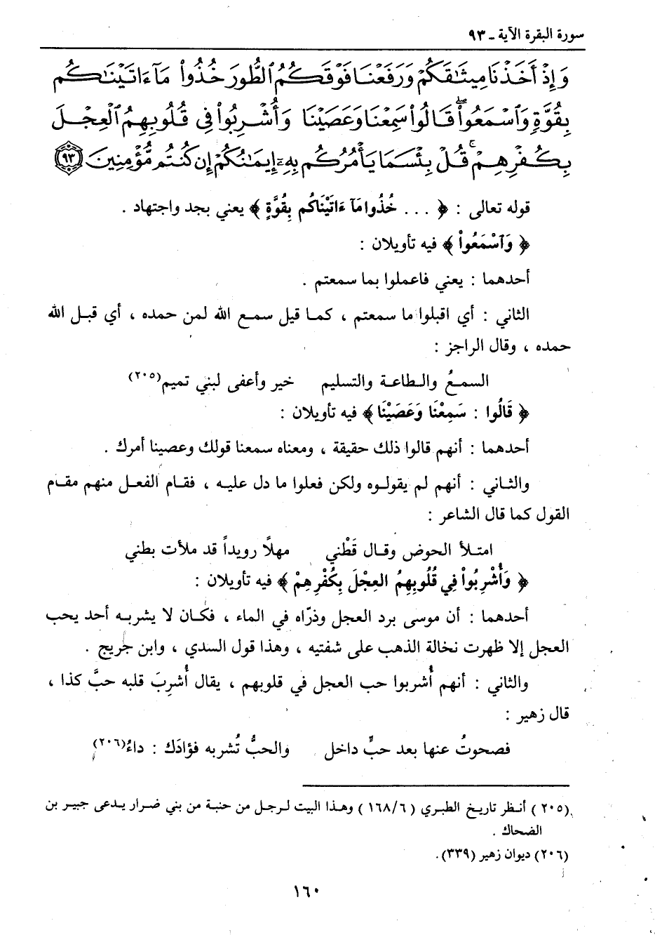 {وَأُشْرِبُواْ فِي قُلُوبِهِمُ العِجْلَ بِكُفْرِهِمْ} فيه تأويلان: أحدهما: أن موسى برد العجل وذرّاه في الماء , فكان لا يشربه أحد يحب العجل إلا ظهرت نخالة الذهب على شفتيه , وهذا قول السدي , وابن جريج. والثاني: أنهم أُشربوا حب العجل في قلوبهم , يقال أُشرِبَ قلبه حبَّ كذا , قال زهير: