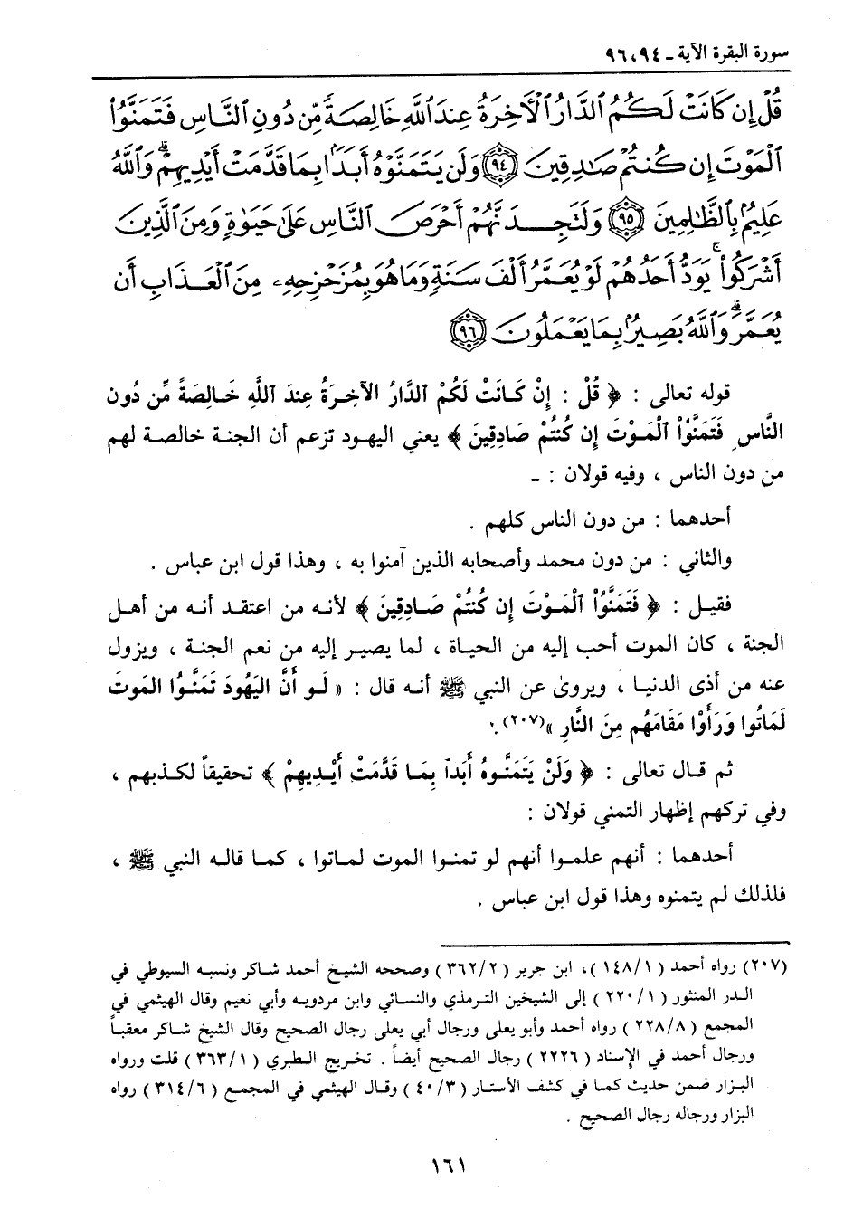 {قل إن كانت لكم الدار الآخرة عند الله خالصة من دون الناس فتمنوا الموت إن كنتم صادقين ولن يتمنوه أبدا بما قدمت أيديهم والله عليم بالظالمين ولتجدنهم أحرص الناس على حياة ومن الذين أشركوا يود أحدهم لو يعمر ألف سنة وما هو بمزحزحه من العذاب أن يعمر والله بصير بما يعملون} قوله تعالى: {قُلْ: إِنْ كَانَتْ لَكُمْ الدَّارُ الآخِرَةُ عِندَ اللهِ خَالِصَةً مِّن دُون النَّاسِ فَتَمَنَّوُاْ الموت إِن كُنتُمْ صَادِقِينَ} يعني اليهود تزعم أن الجنة خالصة لهم من دون الناس , وفيه قولان: أحدهما: من دون الناس كلهم. والثاني: من دون محمد وأصحابه الذين آمنوا به , وهذا قول ابن عباس.
