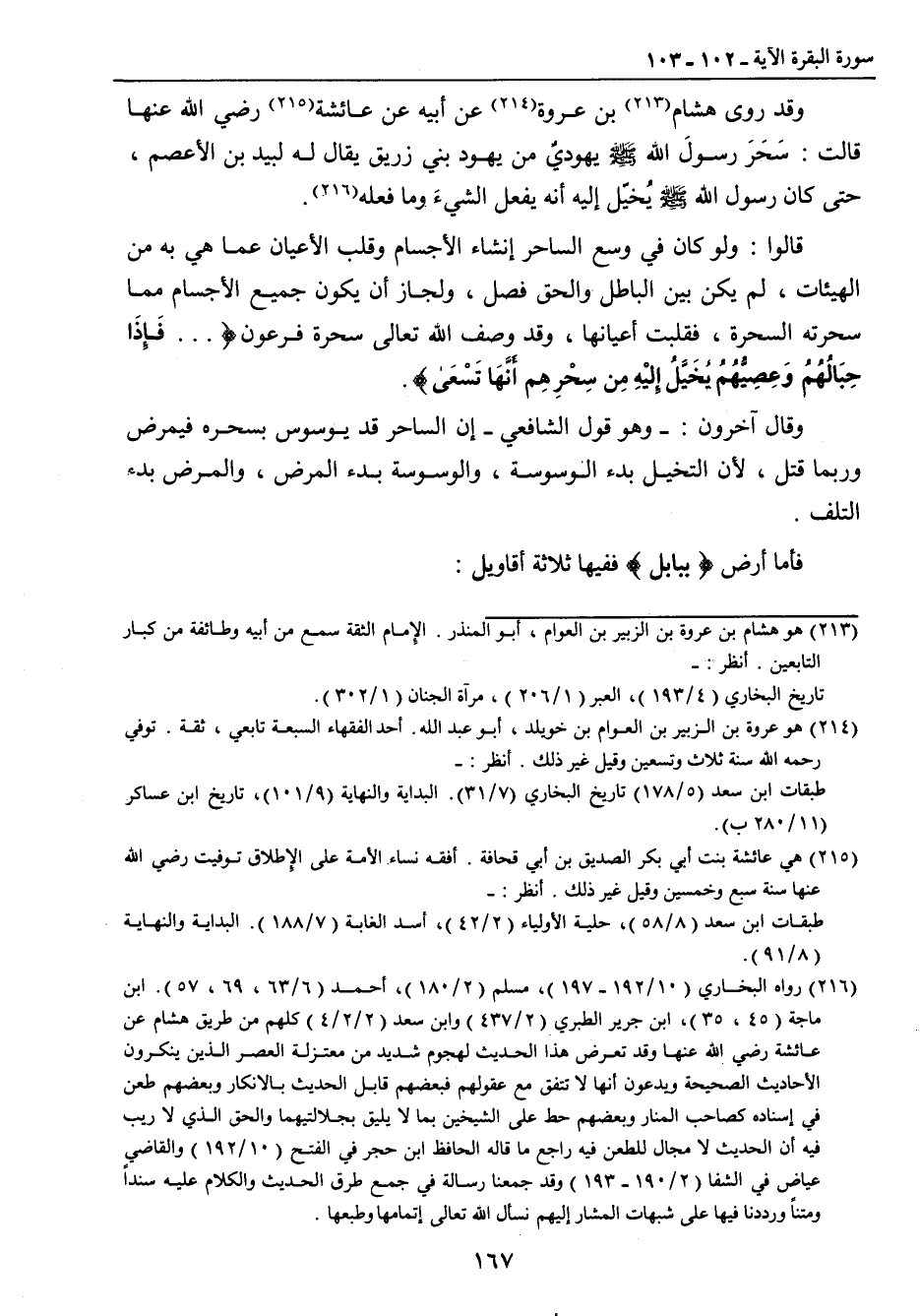 وقد روى هشام بن عروة عن أبيه عن عائشة رضي الله عنها قالت: سَحَرَ رسولَ الله صلى الله عليه وسلم يهوديٌ من يهود بني زريق يقال له لبيد بن الأعصم , حتى كان رسول الله صلى الله عليه وسلم يُخيّل إليه أنه يفعل الشيءَ وما فعله. قالوا: ولو كان في وسع الساحر إنشاء الأجسام وقلب الأعيان عما هي به من الهيئات , لم يكن بين الباطل والحق فصل , ولجاز أن يكون جميع الأجسام مما سحرته السحرة , فقلبت أعيانها , وقد وصف الله تعالى سحرة فرعون { ... فَإِذَا حِبَالُهُمُ وَعِصِيُّهُمُ يُخَيَّلُ إِليْهِ مِن سِحْرِهِم أَنَّهَا تَسْعَى}. وقال آخرون: وهو قول الشافعي إن الساحر قد يوسوس بسحره فيمرض وربما قتل , لأن التخيل بدء الوسوسة , والوسوسة بدء المرض , والمرض بدء التلف. فأما أرض {ببابل} ففيها ثلاثة أقاويل:
