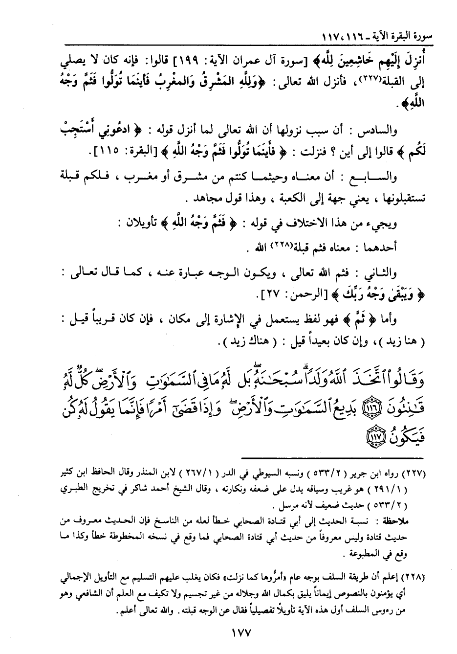 أُنزِلَ إِلَيْهِم خَاشِعِينَ لِلُّه} [سورة آل عمران الآية: 199] قالوا: فإنه كان لا يصلي إلى القبلة , فأنزل الله تعالى: {وَلِلَّهِ المَشْرِقُ وَالمغْرِبُ فَأينَمَا تُوَلُّوا فَثَمَّ وَجْهُ اللهِ}. والسادس: أن سبب نزولها أن الله تعالى لما أنزل قوله: {ادعُوني أسْتَجِبْ لَكُم} قالوا إلى أين؟ فنزلت: {فأَينَمَا تُوَلُّوا فَثَمَّ وَجْهُ اللهِ} [البقرة: 115]. والسابع: أن معناه وحيثما كنتم من مشرق أو مغرب , فلكم قبلة تستقبلونها , يعني جهة إلى الكعبة , وهذا قول مجاهد. ويجيء من هذا الاختلاف في قوله: {فَثَمَّ وَجْهُ اللهِ} تأويلان: أحدهما: معناه فثم قبلة الله. والثاني: فثم الله تعالى , ويكون الوجه عبارة عنه , كما قال تعالى: {وَيَبْقَى وَجْهُ رَبِّكَ} [الرحمن: 27]. وأما {ثَمَّ} فهو لفظ يستعلم في الإشارة إلى مكان , فإن كان قريباً قيل: (هنا زيد) , وإن كان بعيداً قيل: (هناك زيد).