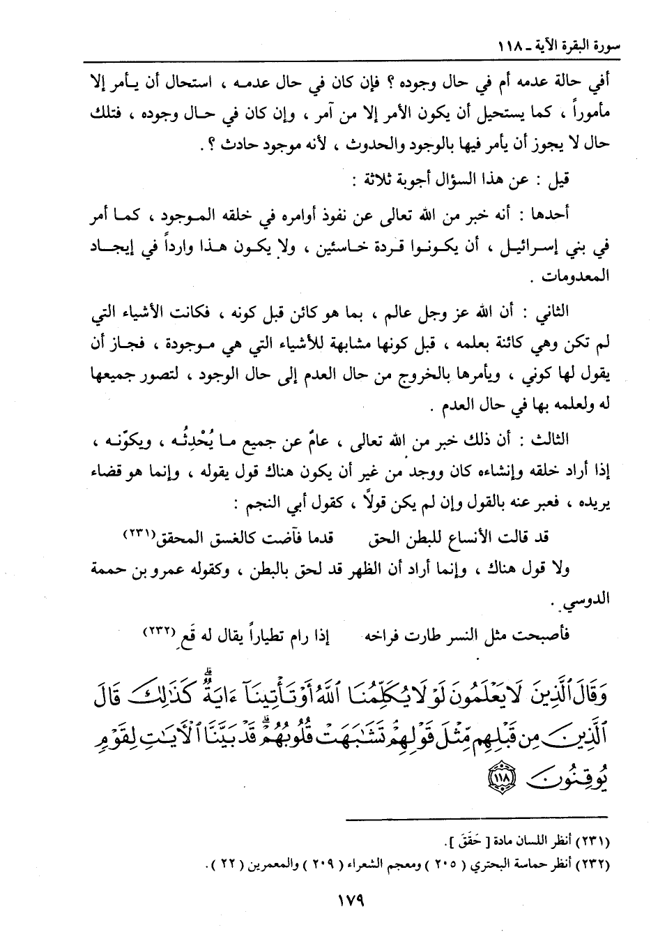 أفي حالة عدمه أم في حال وجوده؟ فإن كان في حال عدمه , استحال أن يأمر إلا مأموراً , كما يستحيل أن يكون الأمر إلا من آمر , وإن كان في حال وجوده , فتلك حال لا يجوز أن يأمر فيها بالوجود والحدوث , لأنه موجود حادث؟. قيل: عن هذا السؤال أجوبة ثلاثة: أحدها: أنه خبر من الله تعالى عن نفوذ أوامره في خلقه الموجود , كما أمر في بني إسرائيل , أن يكونوا قردة خاسئين , ولا يكون هذا وارداً في إيجاد المعدومات. الثاني: أن الله عز وجل عالم , بما هو كائن قبل كونه , فكانت الأشياء التي لم تكن وهي كائنة بعلمه , قبل كونها مشابهة للأشياء التي هي موجودة , فجاز أن يقول لها كوني , ويأمرها بالخروج من حال العدم إلى حال الوجود , لتصور جميعها له ولعلمه بها في حال العدم. والثالث: أن ذلك خبر من الله تعالى , عامٌ عن جميع ما يُحْدِثُه , ويكوّنه , إذا أراد خلقه وإنشاءه كان ووجد من غير أن يكون هناك قول يقوله , وإنما هو قضاء يريده , فعبر عنه بالقول وإن لم يكن قولاً , كقول أبي النجم:
