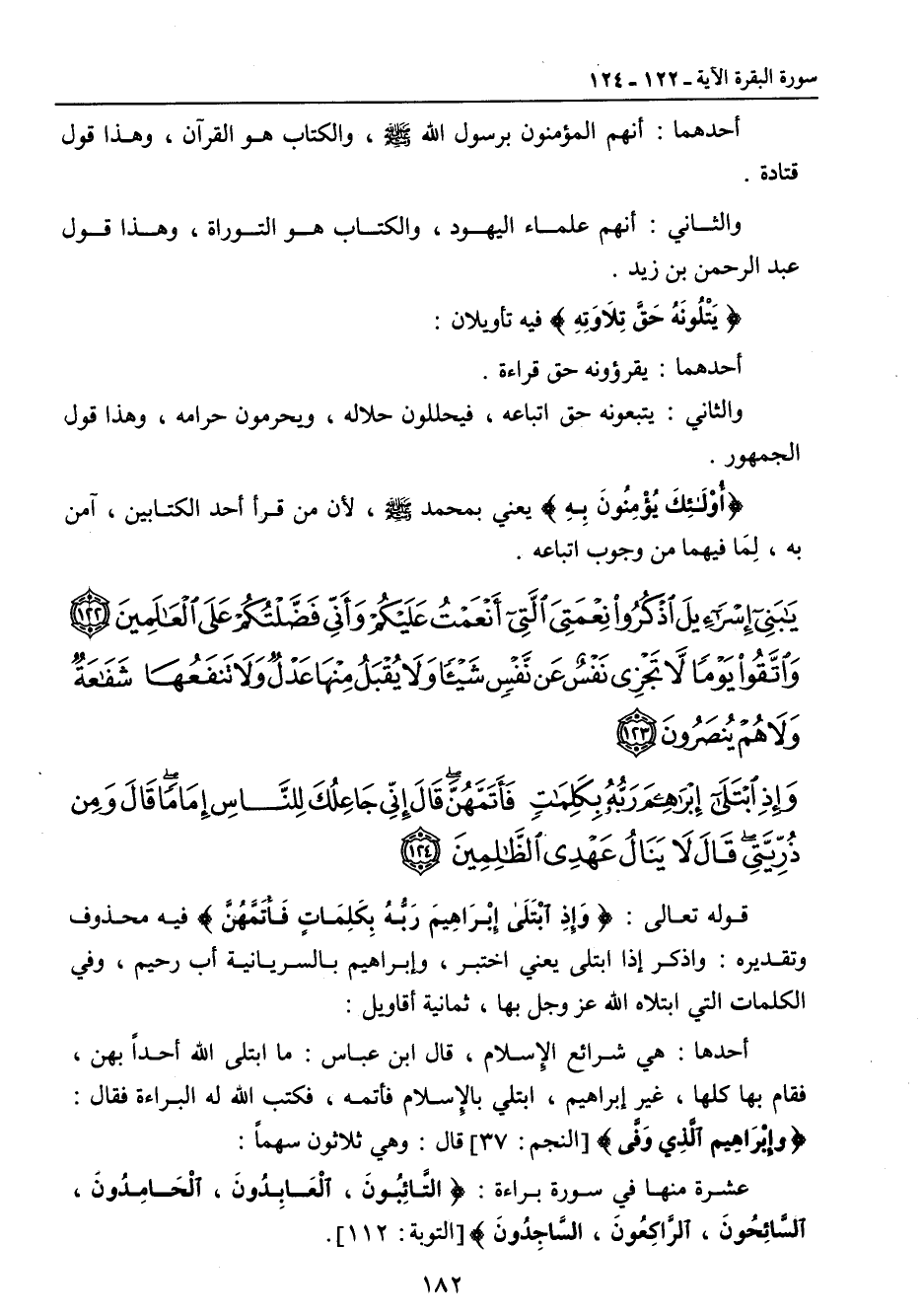 {يا بني إسرائيل اذكروا نعمتي التي أنعمت عليكم وأني فضلتكم على العالمين واتقوا يوما لا تجزي نفس عن نفس شيئا ولا يقبل منها عدل ولا تنفعها شفاعة ولا هم ينصرون وإذ ابتلى إبراهيم ربه بكلمات فأتمهن قال إني جاعلك للناس إماما قال ومن ذريتي قال لا ينال عهدي الظالمين} قوله تعالى: {وإذ ابتلى إبراهيم ربه بكلماتٍ فأتمهن} فيه محذوف وتقديره: واذكر إذا ابتلى يعني اختبر , وإبراهيم بالسريانية أب رحيم , وفي الكلمات التي ابتلاه الله عز وجل بها , ثمانية أقاويل: أحدها: هي شرائع الإِسلام , قال ابن عباس: ما ابتلى الله أحداً بهن , فقام بها كلها , غير إبراهيم , ابتلي بالإِسلام فأتمه , فكتب الله له البراءة فقال: {وإبراهيم الذي وَفَّى} [النجم: 37] قال: وهي ثلاثون سهماً: عشرة منها في سورة براءة: {التائبون , العابدون , الحامدون , السائحون , الراكعون , الساجدون} [التوبة: 112].