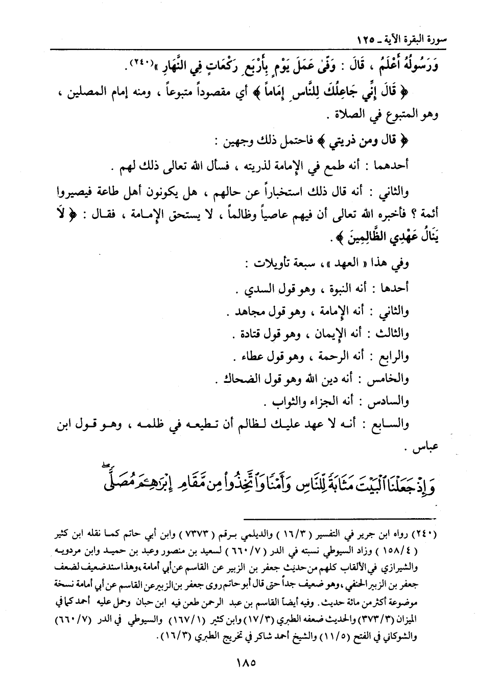 وَرَسُولُهُ أعْلَمُ , قَالَ: وَفّى عَمَلَ يَوْمٍ بِأرْبَعِ رَكْعَاتٍ فِي النَّهَارِ) {قَالَ إنَّي جَاعِلُكَ لِلنَّاسِ إمَاماً} أي مقصوداً متبوعاً , ومنه إمام المصلين , وهو المتبوع في الصلاة. {قال ومن ذريتي} فاحتمل ذلك وجهين: أحدهما: أنه طمع في الإمامة لذريته , فسأل الله تعالى ذلك لهم. والثاني: أنه قال ذلك استخباراً عن حالهم , هل يكونون أهل طاعة فيصيروا أئمة؟ فأخبره الله تعالى أن فيهم عاصياً وظالماً , لا يستحق الإمامة , فقال: {لاَ يَنَالُ عَهْدِي الظَّالِمِينَ}. وفي هذا العهد , سبعة تأويلات: أحدها: أنه النبوة , وهو قول السدي. والثاني: أنه الإمامة , وهو قول مجاهد. والثالث: أنه الإيمان , وهو قول قتادة. والرابع: أنه الرحمة , وهو قول عطاء. والخامس: أنه دين الله وهو قول الضحاك. والسادس: أنه الجزاء والثواب. والسابع: أنه لا عهد عليك لظالم أنه تطيعه في ظلمة , وهو قول ابن عباس.