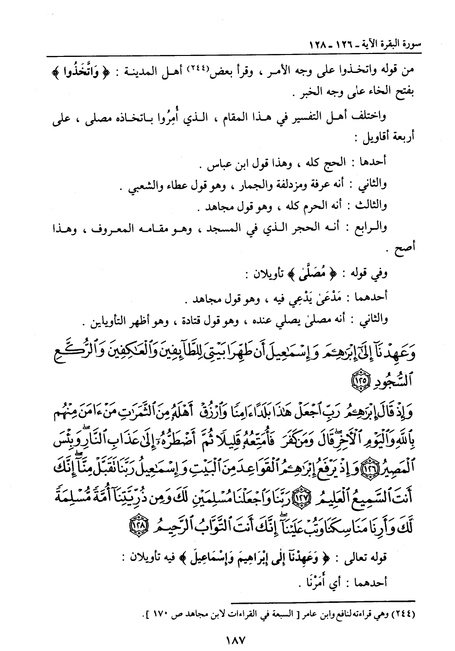 من قوله واتخذوا على وجه الأمر , وقرأ بعض أهل المدينة: {وَاتَّخّذُوا} بفتح الخاء على وجه الخبر. واختلف أهل التفسير في هذا المقام , الذي أُمِرُوا باتخاذه مصلى , على أربعة أقاويل: أحدها: الحج كله , وهذا قول ابن عباس. والثاني: أنه عرفة ومزدلفة والجمار , وهو قول عطاء والشعبي. والثالث: أنه الحرم كله , وهو قول مجاهد. والرابع: أنه الحجر الذي في المسجد , وهو مقامه المعروف , وهذا أصح. وفي قوله: {مُصَلَّى} تأويلان: أحدهما: مَدْعَى يَدْعِي فيه , وهو قول مجاهد. والثاني: أنه مصلى يصلي عنده , وهو قول قتادة , وهو أظهر التأويلين. قوله تعالى: {وَعَهِدْنآ إِلى إبْرَاهِمَ وَإِسْمَاعِيلَ} فيه تأويلان: أحدهما: أي أَمَرْنَا.
