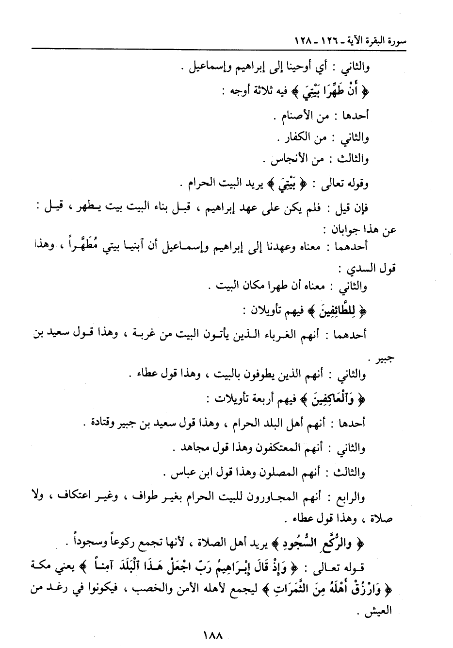 والثاني: أي أوحينا إلى إبراهيم وإسماعيل. {أنْ طَهِّرَا بَيْتِيَ} فيه ثلاثة أوجه: أحدها: من الأصنام. والثاني: من الكفار. والثالث: من الأنجاس. وقوله تعالى: {بَيْتِيَ} يريد البيت الحرام. فإن قيل: فلم يكن على عهد إبراهيم , قبل بناء البيت بيت يطهر , قيل: عن هذا جوابان: أحدهما: معناه وعهدنا إلى إبراهيم وإسماعيل أن ابنيا بيتي مُطَهَّراً , وهذا قول السدي. والثاني: معناه أن طهرا مكان البيت. {لِلطَّائِفِينَ} فيهم تأويلان: أحدهما: أنهم الغرباء الذين يأتون البيت من غربة , وهذا قول سعيد بن جبير. والثاني: أنهم الذين يطوفون بالبيت , وهذا قول عطاء. {وَالْعَاكِفِينَ} فيهم أربعة تأويلات: أحدها: أنهم أهل البلد الحرام , وهذا قول سعيد بن جبير وقتادة. والثاني: أنهم المعتكفون وهذا قول مجاهد. والثالث: أنهم المصلون وهذا قول ابن عباس. والرابع: أنهم المجاورون للبيت الحرام بغير طواف , وغير اعتكاف , ولا صلاة , وهذا قول عطاء. {والرُّكَّعِ السُّجُودِ} يريد أهل الصلاة , لأنها تجمع ركوعاً وسجوداً. قوله تعالى: {وَإِذْ قَالَ إِبْرَاهِيمُ رَبّ اجْعَلْ هَذَا الْبَلَدَ آمِناً} يعني مكة {وَارْزُقْ أهْلَهُ مِنَ الثَّمَرَاتِ} ليجمع لأهله الأمن والخصب , فيكونوا في رغد من العيش.