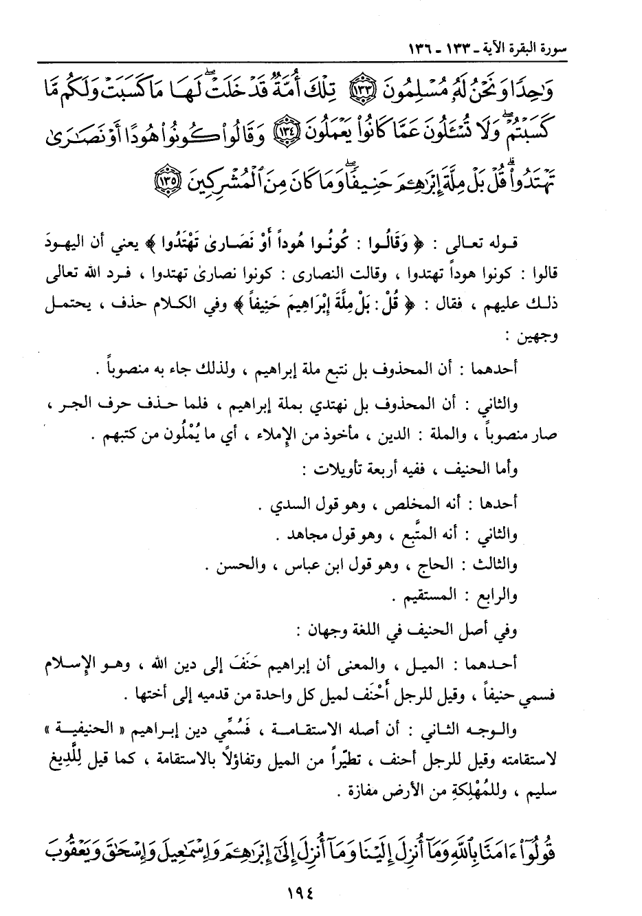 واحدا ونحن له مسلمون تلك أمة قد خلت لها ما كسبت ولكم ما كسبتم ولا تسألون عما كانوا يعملون وقالوا كونوا هودا أو نصارى تهتدوا قل بل ملة إبراهيم حنيفا وما كان من المشركين} قوله تعالى: {وَقَالُوا: كُونُوا هُوداً أوْ نَصَارى تَهْتَدُوا} يعني أن اليهودَ قالوا: كونوا هوداً تهتدوا , وقالت النصارى: كونوا نصارى تهتدوا , فرد الله تعالى ذلك عليهم , فقال: {قُلْ: بَلْ مِلَّةَ إِبْرَاهِيمَ حَنِيفاً} وفي الكلام حذف , يحتمل وجهين: أحدهما: أن المحذوف بل نتبع ملة إبراهيم , ولذلك جاء به منصوباً. والثاني: أن المحذوف بل نهتدي بملة إبراهيم , فلما حذف حرف الجر , صار منصوباً , والملة: الدين , مأخوذ من الإملاء , أي ما يُمْلُون من كتبهم. وأما الحنيف , ففيه أربعة تأويلات: أحدها: أنه المخلص , وهو قول السدي. والثاني: أنه المتَّبع , وهو قول مجاهد. والثالث: الحاج , وهو قول ابن عباس , والحسن. والرابع: المستقيم. وفي أصل الحنيف في اللغة وجهان: أحدهما: الميل , والمعنى أن إبراهيم حَنَفَ إلى دين الله , وهو الإسلام فسمي حنيفاً , وقيل للرجل أحْنَف لميل كل واحدة من قدميه إلى أختها. والوجه الثاني: أن أصله الاستقامة , فَسُمِّي دين إبراهيم (الحنيفية) لاستقامته وقيل للرجل أحنف , تطيّراً من الميل وتفاؤلاً بالاستقامة , كما قيل لِلًّدِيغ سليم , وللمُهْلِكةِ من الأرض مفازة.