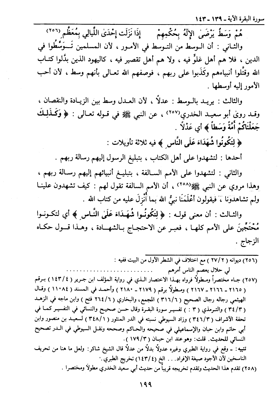 والثاني: أن الوسط من التوسط في الأمور , لأن المسلمين تَوَسَّطُوا في الدين , فلا هم أهل غلوٍّ فيه , ولا هم أهل تقصير فيه , كاليهود الذين بدَّلوا كتاب الله وقتَّلوا أنبياءهم وكَذَبوا على ربهم , فوصفهم الله تعالى بأنهم وسط , لأن أحب الأمور إليه أوسطها. والثالث: يريد بالوسط: عدلاً , لأن العدل وسط بين الزيادة والنقصان , وقد روى أبو سعيد الخدري , عن النبي صلى الله عليه وسلم في قوله تعالى: {وَكَذَلِكَ جَعَلْنَاكُمْ أمَّةً وَسَطاً} أي عَدْلاً. {لِتَكُونُوا شُهَدَاءَ عَلَى النَّاسِ} فيه ثلاثة تأويلات: أحدها: لتشهدوا على أهل الكتاب , بتبليغ الرسول إليهم رسالة ربهم. والثاني: لتشهدوا على الأمم السالفة , بتبليغ أنبيائهم إليهم رسالة ربهم , وهذا مروي عن النبي صلى الله عليه وسلم , أن الأمم السالفة تقول لهم: كيف تشهدون علينا ولم تشاهدونا , فيقولون أعْلَمَنَا نبيُّ الله بما أُنْزِلَ عليه من كتاب الله. والثالث: أن معنى قوله: {لِتَكُونُوا شُهَدَاءَ عَلَى النَّاسِ} أي لتكونوا مُحْتَجِّينَ على الأمم كلها , فعبر عن الاحتجاج بالشهادة , وهذا قول حكاه الزجاج.