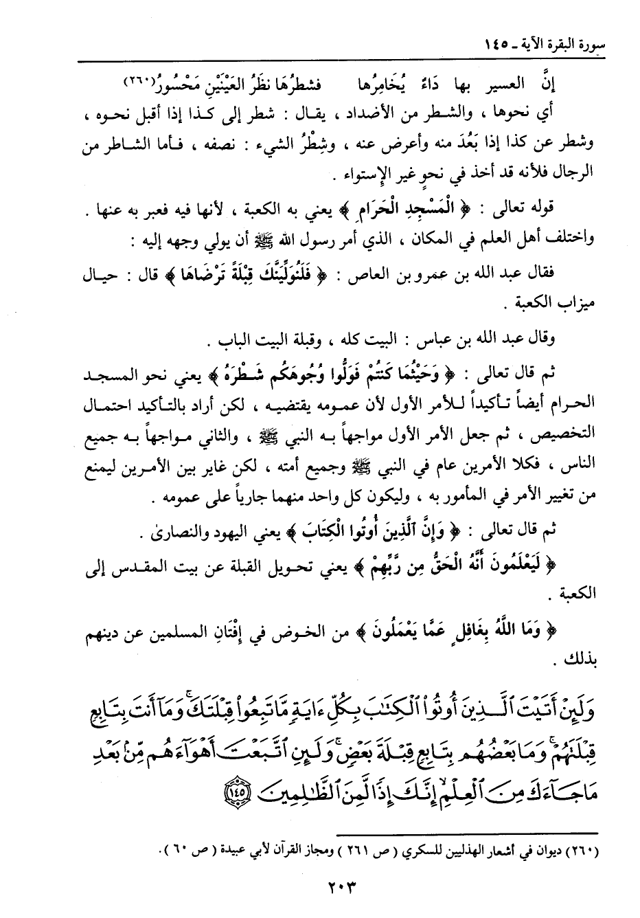 أي نحوها , والشطر من الأضداد , يقال: شطر إلى كذا إذا أقبل نحوه , وشطر عن كذا إذا بَعُدَ منه وأعرض عنه , وشِطْرُ الشيء: نصفه , فأما الشاطر من الرجال فلأنه قد أخذ في نحوٍ غير الإِستواء. قوله تعالى: {الْمَسْجِدِ الْحَرَامِ} يعني به الكعبة , لأنها فيه فعبر به عنها. واختلف أهل العلم في المكان , الذي أمر رسول الله صلى الله عليه وسلم أن يولي وجهه إليه: فقال عبد الله بن عمرو بن العاص: {فَلَنُولِّيَنَّكَ قِبْلَةً تَرْضَاهَا} قال: حيال ميزاب الكعبة. وقال عبد الله بن عباس: البيت كله , وقبلة البيت الباب. ثم قال تعالى: {وَحَيْثُمَا كَنتُمْ فَوَلُّوا وُجُوهَكُم شَطْرَهُ} يعني نحو المسجد الحرام أيضاً تأكيداً للأمر الأول لأن عمومه يقتضيه , لكن أراد بالتأكيد احتمال التخصيص , ثم جعل الأمر الأول مواجهاً به النبي صلى الله عليه وسلم , والثاني مواجهاً به جميع الناس , فكلا الأمرين عام في النبي صلى الله عليه وسلم وجميع أمته , لكن غاير بين الأمرين ليمنع من تغيير الأمر في المأمور به , وليكون كل واحد منهما جارياً على عمومه. ثم قال تعالى: {وَإِنَّ الَّذِينَ أُوتُوا الْكِتَابَ} يعني اليهود والنصارى. {لَيَعْلَمُونَ أَنَّهُ الْحَقُّ مِن رَّبِّهِمْ} يعني تحويل القبلة عن بيت المقدس إلى الكعبة. {وَمَا اللهُ بِغَافِلٍ عَمَّا يَعْمَلُونَ} من الخوض في إِفْتَانِ المسلمين عن دينهم بذلك.