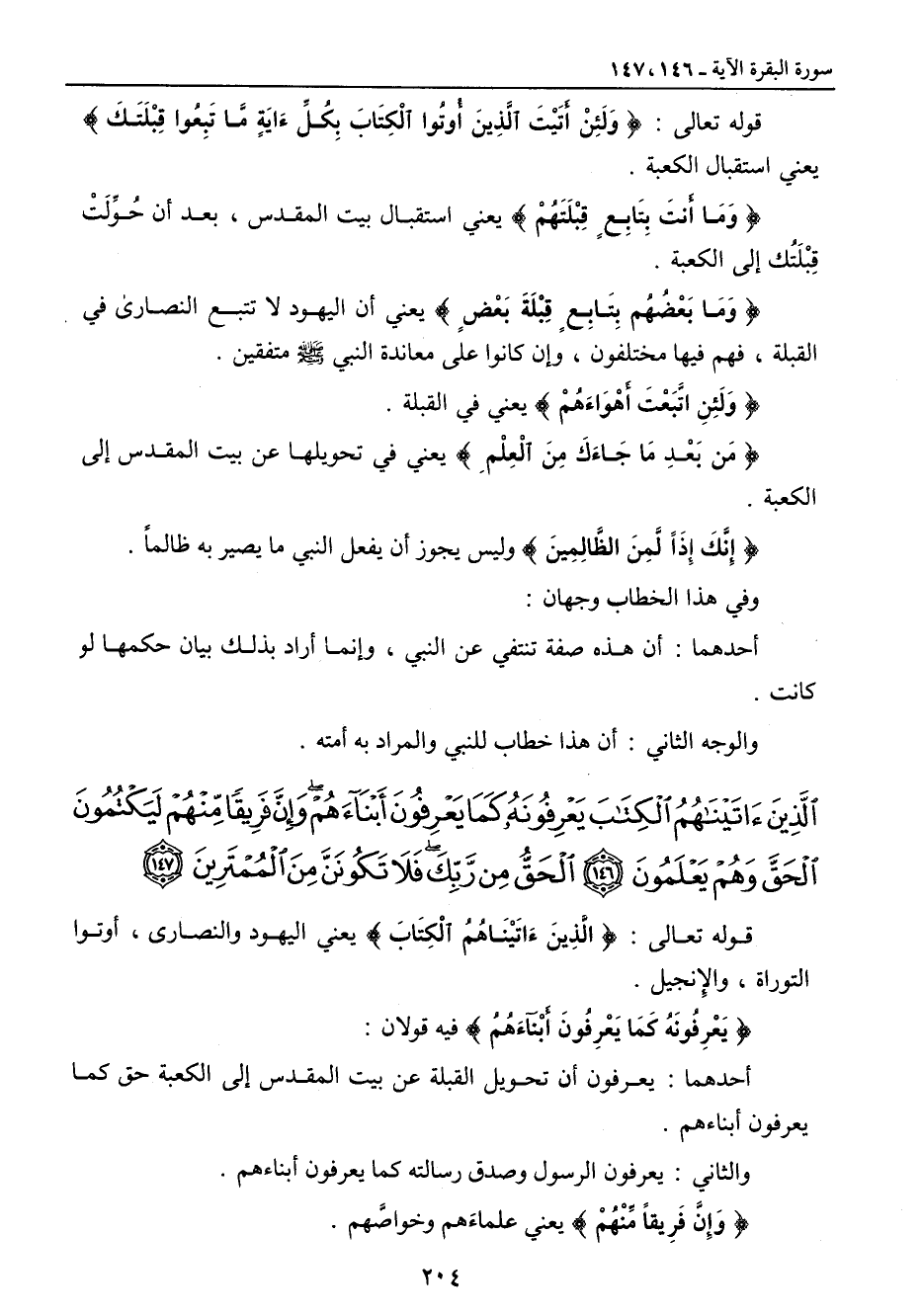قوله تعالى: {وَلَئِنْ أَتَيْتَ الَّذِينَ أُوتُوا الْكِتَابَ بِكُلِّءَايَةٍ مَّا تَبِعُوا قِبْلَتَكَ} يعني استقبال الكعبة. {وَمَا أَنتَ بِتَابِعٍ قِبْلَتَهُم} يعني استقبال بيت المقدس , بعد أن حُوِّلَتْ قِبْلَتُك إلى الكعبة. {وَمَا بَعْضُهُم بِتَابٍعِ قِبْلَةَ بَعْضٍ} يعني أن اليهود لا تتبع النصارى في القبلة , فهم فيها مختلفون , وإن كانوا على معاندة النبي صلى الله عليه وسلم متفقين. {وَلَئِنِ اتَّبَعْتَ أَهْوَاءَهُمْ} يعني في القبلة. {مَن بَعْدِ مَا جَاءَكَ مِنَ الْعِلْمِ} يعني في تحويلها عن بيت المقدس إلى الكعبة. {إِنَّكَ إِذَاً لَّمِنَ الظَّالِمِينَ} وليس يجوز أن يفعل النبي ما يصير به ظالماً. وفي هذا الخطاب وجهان: أحدهما: أن هذه صفة تنتفي عن النبي , وإنما أراد بذلك بيان حكمها لو كانت. والوجه الثاني: أن هذا خطاب للنبي والمراد به أمته.