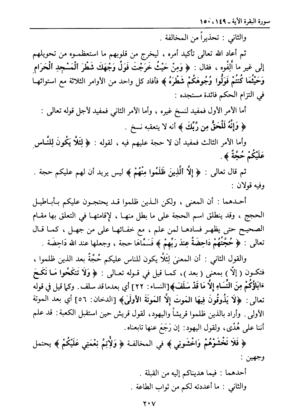 والثاني: تحذيراً من المخالفة. ثم أعاد الله تعالى تأكيد أمره , ليخرج من قلوبهم ما استعظموه من تحويلهم إلى غير ما أَلِفُوه , فقال: {وَمِنْ حَيْثُ خَرَجْتَ فَوَلِّ وَجْهَكَ شَطْرَ الْمَسْجِدِ الْحَرَامِ وَحَيْثُمَا كُنتُمْ فَوَلُّوا وُجُوهَكُمْ شَطْرَهُ} فأفاد كل واحد من الأوامر الثلاثة مع استوائها في التزام الحكم فائدة مستجده: أما الأمر الأول فمفيد لنسخ غيره , وأما الأمر الثاني فمفيد لأجل قوله تعالى: {وَإِنَّهُ لَلْحَقُّ مِن رَّبِّكَ} أنه لا يتعقبه نسخ. وأما الأمر الثالث فمفيد أن لا حجة عليهم فيه , لقوله: {لِئَلاَّ يَكُونَ لِلنَّاسِ عَلَيْكُمْ حُجَّةٌ}. ثم قال تعالى: {إِلاَّ الَّذِينَ ظَلَمُوا مِنْهُمُ} ليس يريد أن لهم عليكم حجة. وفيه قولان: أحدهما: أن المعنى , ولكن الذين ظلموا قد يحتجون عليكم بأباطيل الحجج , وقد ينطلق اسم الحجة على ما بطل منها , لإقامتها في التعلق بها مقام الصحيح حتى يظهر فسادها لمن علم , مع خفائها على من جهل , كما قال تعالى {حُجَّتُهُمْ دَاحِضَةٌ عِندَ رَبِّهِمْ} فَسَمَّاهَا حجة , وجعلها عند الله دَاحِضَةْ. والقول الثاني: أن المعنى لِئَلاَّ يكون للناس عليكم حُجَّةٌ بعد الذين ظلموا , فتكون (إلاّ) بمعنى (بعد)] كما قيل في قوله تعالى: {وَلاَ تَنكَحُوا مَا نَكَحَءَابَاءُكُمْ مِنَ النِّسَاءِ إِلاَّ مَا قَدْ سَلَفَ} [النساء: 22] أي بعدما قد سلف. وكما قيل في قوله تعالى: {لاَ يَذُوقُونَ فِيهَا المَوتَ إِلاَّ المَوتَةَ الأولى} [الدخان: 56] أي بعد الموتة الأولى. وأراد بالذين ظلموا قريشاً واليهود , لقول قريش حين استقبل الكعبة: قد علم أننا على هُدًى , ولقول اليهود: إن رَجَعَ عنها تابعناه. {فَلاَ تَخْشَوْهُمْ وَاخْشَونِي} في المخالفة {وَلأُتِمَّ نِعْمَتي عَلَيْكُمْ} يحتمل وجهين: أحدهما: فيما هديناكم إليه من القبلة. والثاني: ما أعددته لكم من ثواب الطاعة.