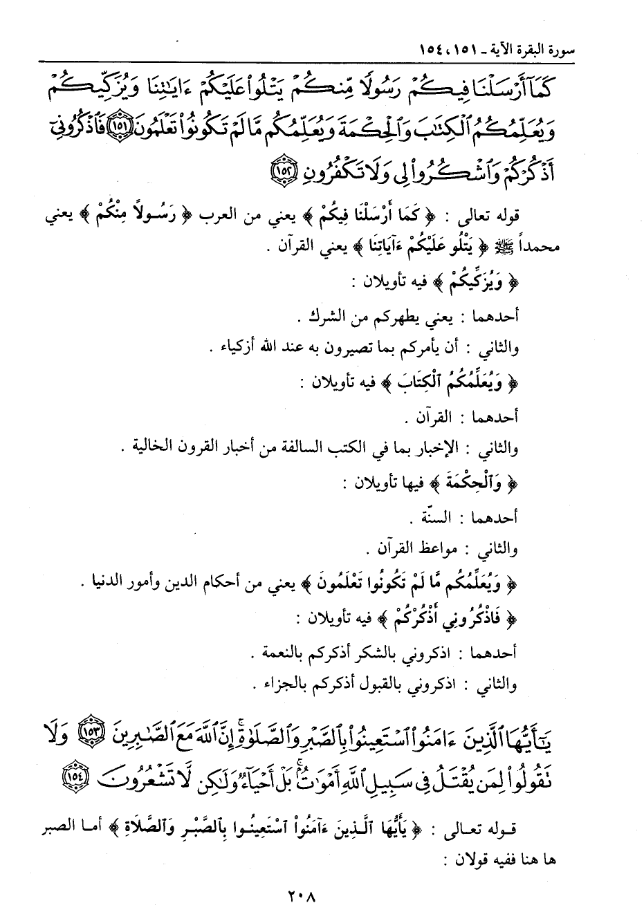 {كما أرسلنا فيكم رسولا منكم يتلو عليكم آياتنا ويزكيكم ويعلمكم الكتاب والحكمة ويعلمكم ما لم تكونوا تعلمون فاذكروني أذكركم واشكروا لي ولا تكفرون} قوله تعالى: {كَمَا أَرْسَلْنَا فِيكُمْ} يعني من العرب {رَسُولاً مِّنكُمْ} يعني محمداً صلى الله عليه وسلم {يَتْلُوا عَلَيْكُمْءَآيَاتِنَا} يعني القرآن. {وَيُزَكِّيكُمْ} فيه تأويلان: أحدهما: يعني يطهركم من الشرك. والثاني: أن يأمركم بما تصيرون به عند الله أزكياء. {وَيُعَلِّمُكُمُ الْكَتَابَ} فيه تأويلان: أحدهما: القرآن. والثاني: الإخبار بما في الكتب السالفة من أخبار القرون الخالية. {وَالحِكْمَةَ} فيها تأويلان: أحدهما: السنّة. والثاني: مواعظ القرآن. {وَيُعَلِّمُكُم مَّا لَمْ تَكُونُوا تَعْلَمُونَ} يعني من أحكام الدين وأمور الدنيا. {فَاذْكُرُوني أَذْكُرْكُمْ} فيه تأويلان: أحدهما: اذكروني بالشكر أذكركم بالنعمة. والثاني: اذكروني بالقبول أذكركم بالجزاء.