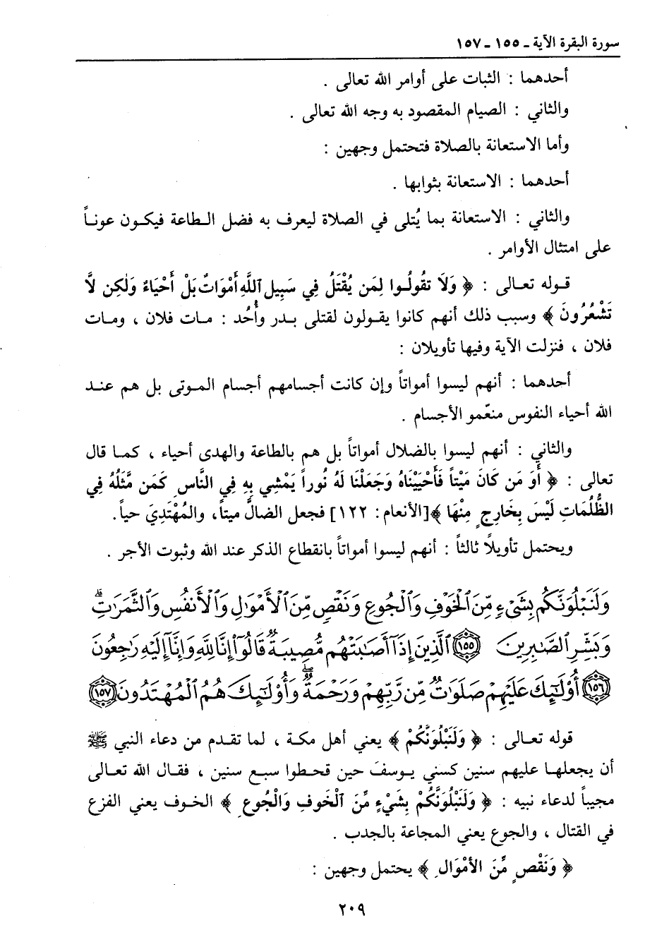 أحدهما: الثبات على أوامر الله تعالى. والثاني: الصيام المقصود به وجه الله تعالى. وأما الاستعانة بالصلاة فتحتمل وجهين: أحدهما: الاستعانة بثوابها. والثاني: الاستعانة بما يُتلى في الصلاة ليعرف به فضل الطاعة فيكون عوناً على امتثال الأوامر. قوله تعالى: {وَلاَ تَقُولُوا لِمَن يُقْتَلُ في سَبِيلِ اللهِ أَمْوَتٌ بَلْ أَحْيَآءٌ وَلَكِن لاَّ تَشْعُرُونَ} وسبب ذلك أنهم كانوا يقولون لقتلى بدر وأُحُد: مات فلان , ومات فلان , فنزلت الآية وفيها تأويلان: أحدهما: أنهم ليسوا أمواتاً وإن كانت أجسامهم أجسام الموتى بل هم عند الله أحياء النفوس منعّمو الأجسام. والثاني: أنهم ليسوا بالضلال أمواتاً بل هم بالطاعة والهدى أحياء , كما قال تعالى: {أَوَ مَن كَانَ مَيْتاً فَأَحْيَيْنَاهُ وَجَعَلْنَا لَهُ نُوراً يَمْشِي بِهِ في النَّاسِ كَمَن مَّثَلُهُ في الظُّلُمَاتِ لَيْسَ بِخَارِجٍ مِنْهَا} [الأنعام: 122] فجعل الضالَّ ميتاً , والمُهْتَدي حياً. ويحتمل تأويلاً ثالثاً: أنهم ليسوا أمواتاً بانقطاع الذكر عند الله وثبوت الأجر.