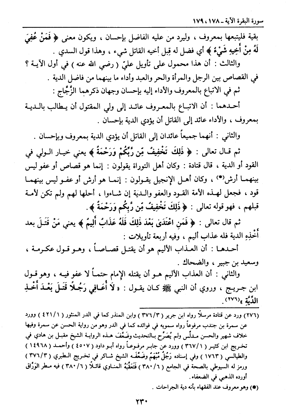 بقية فليتبعها بمعروف , وليرد من عليه الفاضل بإحسان , ويكون معنى {فَمَنْ عُفِيَ لَهُ مِنْ أَخِيهِ شَيْءٌ} أي فضل له قِبل أخيه القاتل شيء , وهذا قول السدي. والثالث: أن هذا محمول على تأويل عليّ (رضي الله عنه) في أول الآية؟ في القصاص بين الرجل والمرأة والحر والعبد وأداء ما بينهما من فاضل الدية. ثم في الاتباع بالمعروف والأداء إليه بإحسان وجهان ذكرهما الزَّجَّاج: أحدهما: أن الاتباع بالمعروف عائد إلى ولي المقتول أن يطالب بالدية بمعروف , والأداء عائد إلى القاتل أن يؤدي الدية بإحسان. والثاني: أنهما جميعاً عائدان إلى القاتل أن يؤدي الدية بمعروف وبإحسان. ثم قال تعالى: {ذَلِكَ تَخْفِيفٌ مِّن رَّبِّكُمْ وَرَحْمَةٌ} يعني خيار الولي في القود أو الدية , قال قتادة: وكان أهل التوراة يقولون: إنما هو قصاص أو عفو ليس بينهما أرش , وكان أهل الإنجيل يقولون: إنما هو أرش أو عفو ليس بينهما قود , فجعل لهذه الأمة القود والعفو والدية إن شاءوا , أحلها لهم ولم تكن لأمة قبلهم , فهو قوله تعالى: {ذَلِكَ تَخْفِيفٌ مِّن رَّبِكُم وَرَحْمَةٌ}. ثم قال تعالى: {فَمَنِ اعْتَدَى بَعْدَ ذلِكَ فَلَهُ عَذَابٌ أَلِيمٌ} يعني مَنْ قَتَلَ بعد أَخْذِهِ الدية فله عذاب أليم , وفيه أربعة تأويلات: أحدها: أن العذاب الأليم هو أن يقتل قصاصاً , وهو قول عكرمة , وسعيد بن جبير , والضحاك. والثاني: أن العذاب الأليم هو أن يقتله الإمام حتماً لا عفو فيه , وهو قول ابن جريج , وروي أن النبي الله عليه وسلم كان يقول: (لاَ أُعَافِي رَجُلاً قَتَلَ بَعْدَ أَخْذِ الدِّيَّةِ).