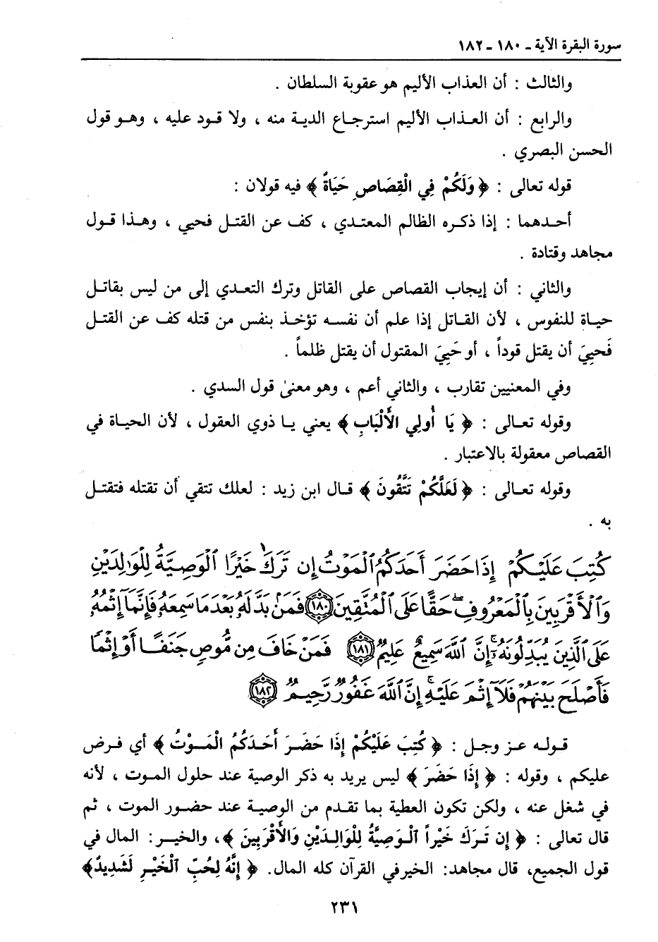 {كتب عليكم إذا حضر أحدكم الموت إن ترك خيرا الوصية للوالدين والأقربين بالمعروف حقا على المتقين فمن بدله بعد ما سمعه فإنما إثمه على الذين يبدلونه إن الله سميع عليم فمن خاف من موص جنفا أو إثما فأصلح بينهم فلا إثم عليه إن الله غفور رحيم} قوله عز وجل: {كُتِبَ عَلَيْكُمْ إِذَا حَضَرَ أَحَدَكُمُ الْمَوْتُ} أي فرض عليكم , وقوله: {إِذَا حَضَرَ} ليس يريد به ذكر الوصية عند حلول الموت , لأنه في شغل عنه , ولكن تكون العطية بما تقدم من الوصية عند حضور الموت , ثم قال تعالى: {إِن تَرَكَ خَيْراً الْوَصِيَّةُ لِلْوَالِدَيْنِ وَالأَقْرَبِينَ} , والخير: المال في قول الجميع , قال مجاهد: الخير في القرآن كله المال. {إِنَّهُ لِحُبِّ الْخَيْرِ لَشَدِيدٌ}