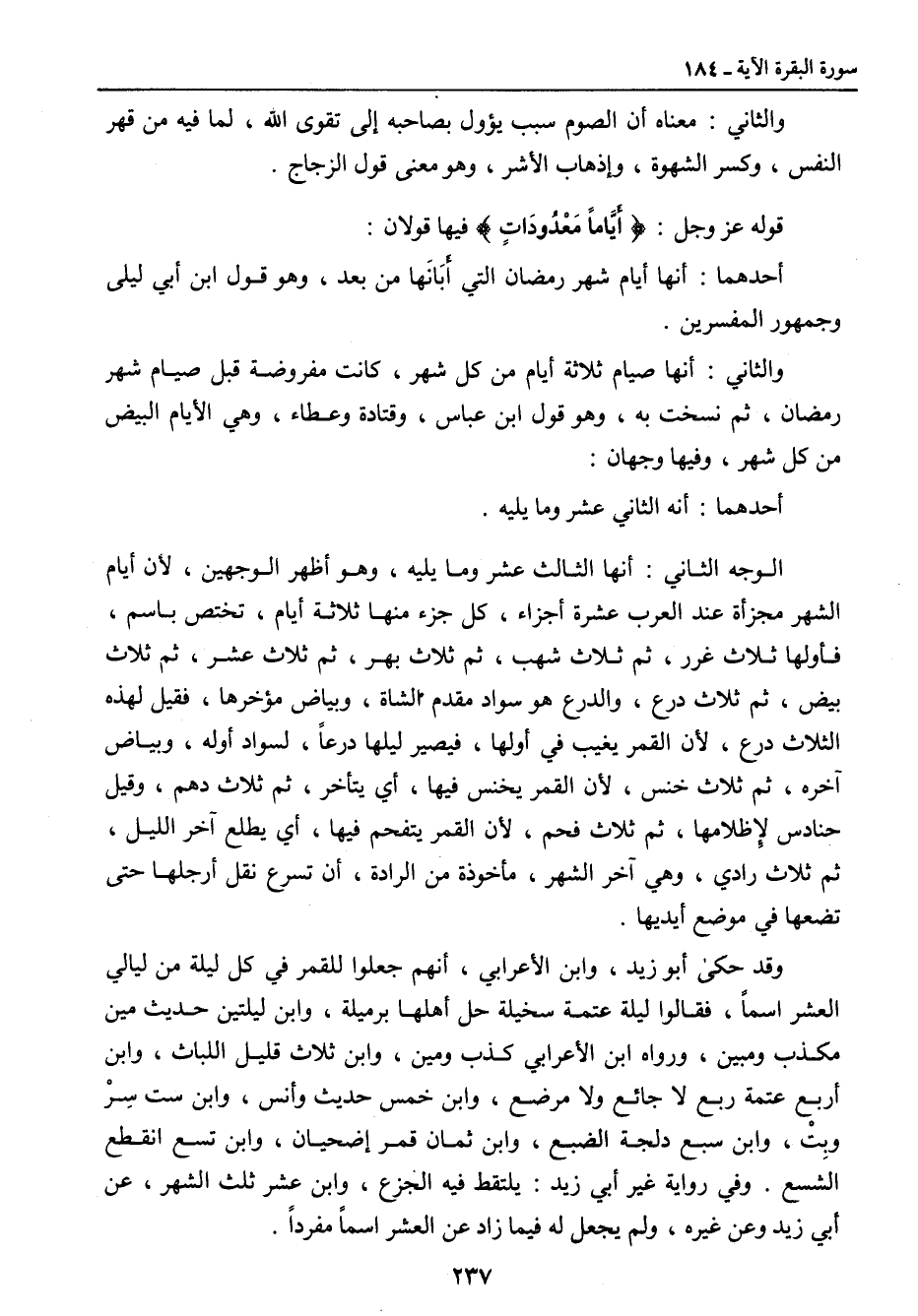 والثاني: معناه أن الصوم سبب يؤول بصاحبه إلى تقوى الله , لما فيه من قه النفس , وكسر الشهوة , وإذهاب الأشر , وهو معنى قول الزجاج. قوله عز وجل: {أَيَّاماً مَعْدُودَاتٍ} فيها قولان: أحدهما: أنها أيام شهر رمضان التي أبانها من بعد , وهو قول ابن أبي ليلى وجمهور المفسرين. والثاني: أنها صيام ثلاثة أيام من كل شهر , كانت مفروضة قبل صيام شهر رمضان , ثم نسخت به , وهو قول ابن عباس , وقتادة وعطاء , وهي الأيام البيض من كل شهر , وفيها وجهان: أحدهما: أنه الثاني عشر وما يليه. الوجه الثاني: أنها الثالث عشر وما يليه , وهو أظهر الوجهين , لأن أيام الشهر مجزأة عند العرب عشرة أجزاء , كل جزء منها ثلاثة أيام , تختص باسم , فأولها ثلاث غرر , ثم ثلاث شهب , ثم ثلاث بهر , ثم ثلاث عشر , ثم ثلاث بيض , ثم ثلاث درع , والدرع هو سواد مقدم الشاة , وبياض مؤخرها , فقيل لهذه الثلاث درع , لأن القمر يغيب في أولها , فيصير ليلها درعاً , لسواد أوله , وبياض آخره , ثم ثلاث خنس , لأن القمر يخنس فيها , أي يتأخر , ثم ثلاث دهم , وقيل حنادس لإظلامها , ثم ثلاث فحم , لأن القمر يتفحم فيها , أي يطلع آخر الليل , ثم ثلاث رادي , وهي آخر الشهر , مأخوذة من الرادة , أن تسرع نقل أرجلها حتى تضعها في موضع أيديها. وقد حكى أبو زيد , وابن الأعرابي , أنهم جعلوا للقمر في كل ليلة من ليالي العشر اسماً , فقالوا ليلة عتمة سخيلة حل أهلها برميلة , وابن ليلتين حديث مين مكذب ومبين , ورواه ابن الأعرابي كذب ومين , وابن ثلاث قليل اللباث , وابن أربع عتمة ربع لا جائع ولا مرضع , وابن خمس حديث وأنس , وابن ست سِرْ وبِتْ , وابن سبع دلجة الضبع , وابن ثمان قمر إضحيان , وابن تسع انقطع الشسع. وفي رواية غير أبي زيد: يلتقط فيه الجزع , وابن عشر ثلث الشهر , عن أبي زيد وعن غيره , ولم يجعل له فيما زاد عن العشر اسماً مفرداً.