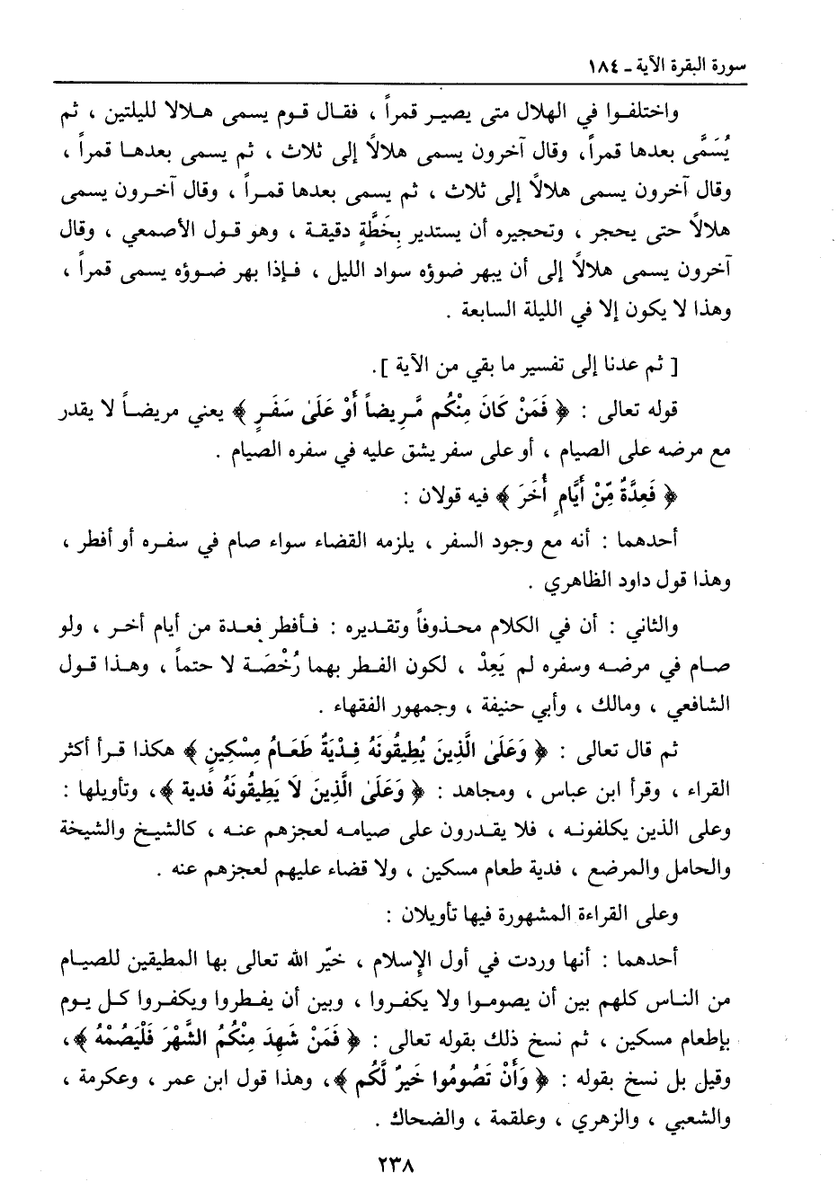 واختلفوا في الهلال متى يصير قمراً , فقال قوم يسمى هلالا لليلتين , ثم يُسَمَّى بعدها قمراً , وقال آخرون يسمى هلالاً إلى ثلاث , ثم يسمى بعدها قمراً , وقال آخرون يسمى هلالاً إلى ثلاث , ثم يسمى بعدها قمراً , وقال آخرون يسمى هلالاً حتى يحجر , وتحجيره أن يستدير بِخَطَّةٍ دقيقة , وهو قول الأصمعي , وقال آخرون يسمى هلالاً إلى أن يبهر ضوؤه سواد الليل , فإذا بهر ضوؤه يسمى قمراً , وهذا لا يكون إلا في الليلة السابعة. [ثم عدنا إلى تفسير ما بقي من الآية]. قوله تعالى: {فَمَنْ كَانَ مِنْكُم مَّرِيضاً أَوْ عَلَى سَفَرٍ} يعني مريضاً لا يقدر مع مرضه على الصيام , أو على سفر يشق عليه في سفره الصيام. {فَعِدَّةٌ مِّنْ أَيَّامٍ أُخَرَ} فيه قولان: أحدهما: أنه مع وجود السفر , يلزمه القضاء سواء صام في سفره أو أفطر , وهذا قول داود الظاهري. والثاني: أن في الكلام محذوفاً وتقديره: فأفطر فعدة من أيام أخر , ولو صام في مرضه وسفره لم يعد , لكون الفطر بهما رُخْصَة لا حتماً , وهذا قول الشافعي , ومالك , وأبي حنيفة , وجمهور الفقهاء. ثم قال تعالى: {وَعَلَى الَّذِينَ يُطِيقُونَهٌ فِدْيَةٌ طَعَامُ مِسْكِينٍ} هكذا قرأ أكثر القراء , وقرأ ابن عباس , ومجاهد: {وَعَلَى الَّذِينَ لاَ يَطِيقُونَهُ فدية} , وتأويلها: وعلى الذين يكلفونه , فلا يقدرون على صيامه لعجزهم عنه , كالشيخ والشيخة والحامل والمرضع , فدية طعام مسكين , ولا قضاء عليهم لعجزهم عنه. وعلى القراءة المشهورة فيها تأويلان: أحدهما: أنها وردت في أول الإسلام , خيّر الله تعالى بها المطيقين للصيام من الناس كلهم بين أن يصوموا ولا يكفروا , وبين أن يفطروا ويكفروا كل يوم بإطعام مسكين , ثم نسخ ذلك بقوله تعالى: {فَمَنْ شَهِدَ مِنْكُمُ الشَّهْرَ فَلْيَصُمْهُ} , وقيل بل نسخ بقوله: {وَأَنْ تَصُومُوا خَيرٌ لَّكُم} , وهذا قول ابن عمر , وعكرمة , والشعبي , والزهري , وعلقمة , والضحاك.