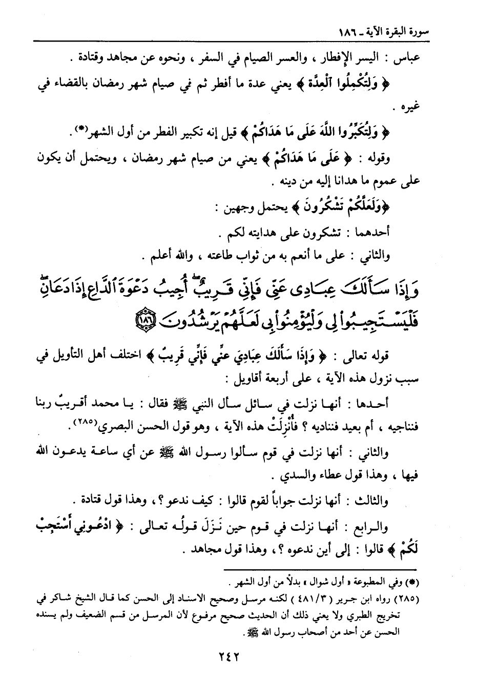 عباس: اليسر الإفطار , والعسر الصيام في السفر , ونحوه عن مجاهد وقتادة. {وَلِتُكْمِلُوا الْعِدَّة} يعني عدة ما أفطر ثم في صيام شهر رمضان بالقضاء في غيره. {ولِتُكّبِّرُوا اللهَ عَلَى مَا هَدَاكُمْ} قيل إنه تكبير الفطر من أول الشهر. وقوله: {عَلَى مَا هَدَاكُمْ} يعني من صيام شهر رمضان , ويحتمل أن يكون على عموم ما هدانا إليه من دينه. {وَلَعَلَّكُمْ تَشْكُرُونَ} يحتمل وجهين: أحدهما: تشكرون على هدايته لكم. والثاني: على ما أنعم به من ثواب طاعته , والله أعلم.