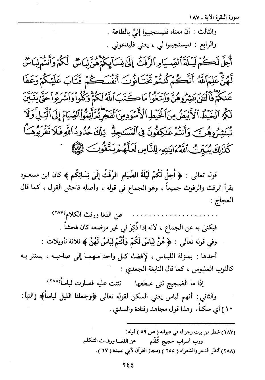 {أحل لكم ليلة الصيام الرفث إلى نسائكم هن لباس لكم وأنتم لباس لهن علم الله أنكم كنتم تختانون أنفسكم فتاب عليكم وعفا عنكم فالآن باشروهن وابتغوا ما كتب الله لكم وكلوا واشربوا حتى يتبين لكم الخيط الأبيض من الخيط الأسود من الفجر ثم أتموا الصيام إلى الليل ولا تباشروهن وأنتم عاكفون في المساجد تلك حدود الله فلا تقربوها كذلك يبين الله آياته للناس لعلهم يتقون} قوله تعالى: {أُحِلَّ لَكُمْ لَيْلَةَ الصِّيَامِ الرَّفَثُ إلَى نِسَآئِكُمْ} كان ابن مسعود يقرأ الرفث والرفوث جميعاً , وهو الجماع في قوله , وأصله فاحش القول , كما قال العجاج: