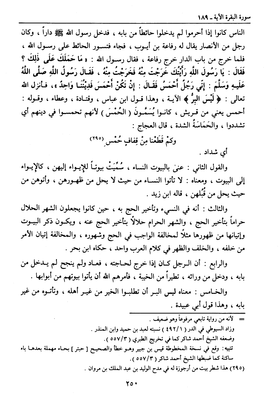 الناس كانوا إذا أحرموا لم يدخلوا حائطاً من بابه , فدخل رسول الله صلى الله عليه وسلم داراً , وكان رجل من الأنصار يقال له رفاعة بن أيوب , فجاء فتسور الحائط على رسول الله , فلما خرج من باب الدار خرج رفاعة , فقال رسول الله: (مَا حَمَلَكَ عَلَى ذلِكَ؟ فَقَالَ: يَا رَسُولَ اللهِ رَأَيْتُكَ خَرَجْتَ مِنْهُ فَخَرَجْتُ مِنْهُ , فَقَالَ رَسُولُ اللهٍ صَلَّى اللهُ عَلَيهِ وسَلَّمَ: إنّي رَجُلٌ أَحْمَسُ فَقَالَ: إِنْ تَكُنْ أَحْمَسَ فَدِيْنُنَا وَاحِدٌ) فأنزل الله تعالى: {لَيْسَ البِرُّ} الآية , وهذا قول ابن عباس , وقتادة , وعطاء , وقوله: أحمس يعني من قريش , كانوا يُسَمَّونَ (الحُمْسَ) لأنهم تحمسوا في دينهم أي تشددوا , والحَمَاسَةُ الشدة , قال العجاج:
