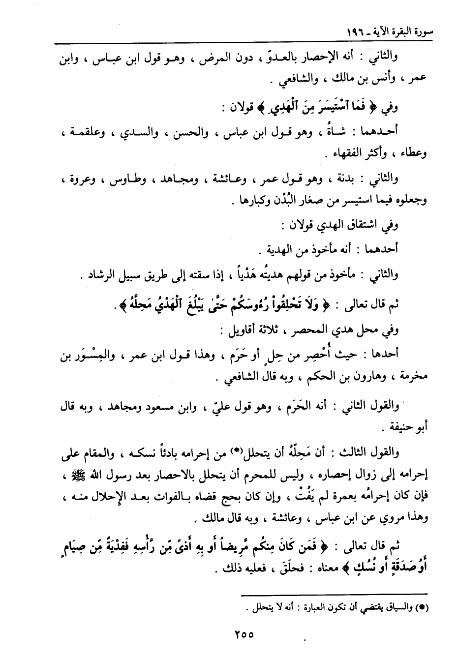 والثاني: أنه الإحصار بالعدوّ , دون المرض , وهو قول ابن عباس , وابن عمر , وأنس بن مالك , والشافعي. وفي {فَمَا استَيْسَرَ مِنَ الْهَدْيِ} قولان: أحدهما: شاةُ , وهو قول ابن عباس , والحسن , والسدي , وعلقمة , وعطاء , وأكثر الفقهاء. والثاني: بدنة , وهو قول عمر , وعائشة , ومجاهد , وطاوس , وعروة , وجعلوه فيما استيسر من صغار البُدْن وكبارها. وفي اشتقاق الهدي قولان: أحدهما: أنه مأخوذ من الهدية. والثاني: مأخوذ من قولهم هديتُه هَدْياً , إذا سقته إلى طريق سبيل الرشاد. ثم قال تعالى: {وَلاَ تَحْلِقُواْ رُءُوسَكُم حَتَّى يَبْلُغَ الْهَدْيُ مَحِلَّهُ}. وفي محل هدي المحصر , ثلاثة أقاويل: أحدها: حيث أُحْصِر من حِلٍ أو حَرَم , وهذا قول ابن عمر , والمِسْوَر بن مخرمة , وهارون بن الحكم , وبه قال الشافعي. والقول الثاني: أنه الحَرَم , وهو قول عليّ , وابن مسعود ومجاهد , وبه قال أبو حنيفة. والقول الثالث: أن مَحِلّهُ أن يتحلل من إحرامه بادئاً نسكه , والمقام على إحرامه إلى زوال إحصاره , وليس للمحرم أن يتحلل بالاحصار بعد رسول الله صلى الله عليه وسلم , فإن كان إحرامُه بعمرة لم يَفُتْ وإن كان بحج قضاه بالفوات بعد الإحلال منه , وهذا مروي عن ابن عباس , وعائشة , وبه قال مالك. ثم قال تعالى: {فَمَن كَانَ مِنكُم مَّرِيضاً أَوْ بِهِ أَذىً مِّن رَّأْسِهِ فَفِدْيَةٌ مِّن صِيَامٍ أَوْ صَدَقَةٍ أَوْ نُسُكٍ} معناه: فحلَقَ , فعليه ذلك.