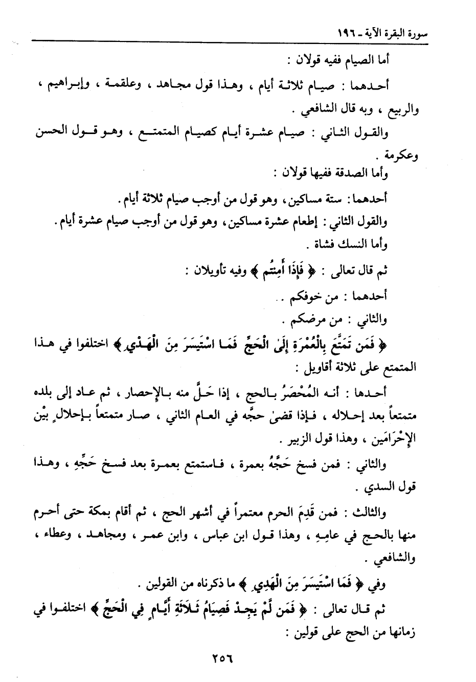 أما الصيام ففيه قولان: أحدهما: صيام ثلاثة أيام , وهذا قول مجاهد , وعلقمة , وإبراهيم , والربيع , وبه قال الشافعي. والقول الثاني: صيام عشرة أيام كصيام المتمتع , وهو قول الحسن وعكرمة. وأما الصدقة ففيها قولان: أحدهما: ستة مساكين , وهو قول من أوجب صيام ثلاثة أيام. والقول الثاني: إطعام عشرة مساكين , وهو قول من أوجب صيام عشرة أيام. وأما النسك فشاة. ثم قال تعالى: {فَإِذَا أَمِنتُم} وفيه تأويلان: أحدهما: من خوفكم. والثاني: من مرضكم. {فَمَن تَمَتَّعَ بِالْعُمْرَةِ إِلى الْحَجِّ فَمَا استَيْسَرَ مِنَ الْهَدْيِ} اختلفوا في هذا المتمتع على ثلاثة أقاويل: أحدها: أنه المُحْصَرُ بالحج , إذا حَلَّ منه بالإحصار , ثم عاد إلى بلده متمتعاً بعد إحلاله , فإذا قضى حجَّه في العام الثاني , صار متمتعاً بإحلالٍ بيْن الإحْرَامَين , وهذا قول الزبير. والثاني: فمن نسخ حَجَّهُ بعمرة , فاستمتع بعمرة بعد فسخ حَجِّهِ , وهذا قول السدي. والثالث: فمن قَدِمَ الحرم معتمراً في أشهر الحج , ثم أقام بمكة حتى أحرم منها بالحج في عامِهِ , وهذا قول ابن عباس , وابن عمر , ومجاهد , وعطاء , والشافعي. وفي {فَمَا استَيْسَرَ مِنَ الْهَدْيِ} ما ذكرناه من القولين. ثم قال تعالى: {فَمَن لَّمْ يَجِدْ فَصِيَامُ ثَلاثَةِ أَيَّمٍ فِي الْحَجِّ} اختلفوا في زمانها من الحج على قولين: