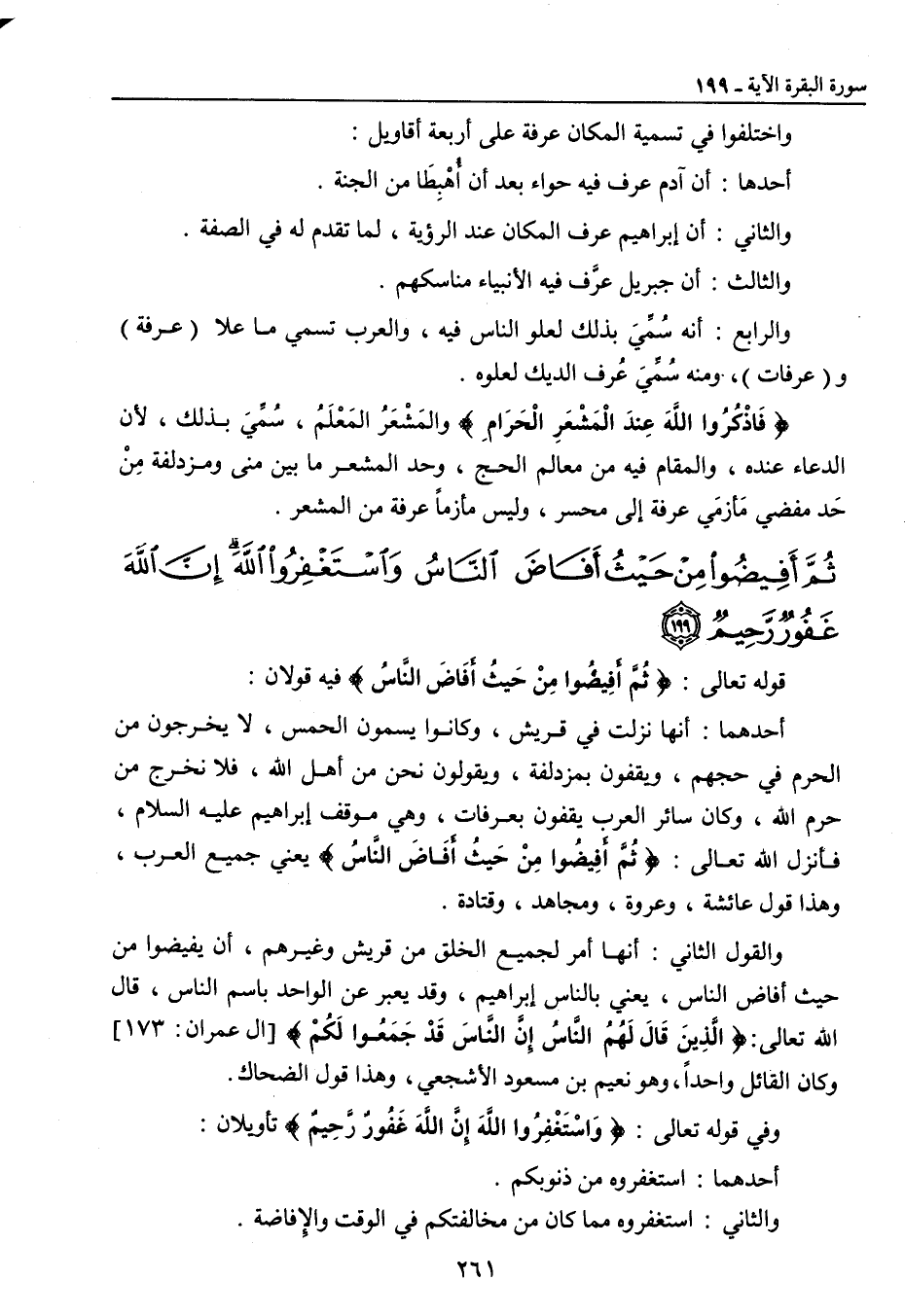 واختلفوا في تسمية المكان عرفة على أربعة أقاويل: أحدها: أن آدم عرف فيه حواء بعد أن أُهْبِطَا من الجنة. والثاني: أن إبراهيم عرف المكان عند الرؤية , لما تقدم له في الصفة. والثالث: أن جبريل عرَّف فيه الأنبياء مناسكهم. والرابع: أنه سُمِّيَ بذلك لعلو الناس فيه , والعرب تسمي ما علا (عرفة) و (عرفات) , ومنه سُمِّيَ عُرف الديك لعلوه. {فَاذْكُرُواْ اللهَ عِندَ الْمَشْعَرِ الْحَرَامِ} والمَشْعَرُ المَعْلَمُ , سُمِّيَ بذلك , لأن الدعاء عنده , والمقام فيه من معالم الحج , وحد المشعر ما بين منى ومزدلفة مِنْ حَد مفضي مَأزمَي عرفة إلى محسر , وليس مأزماً عرفة من المشعر.