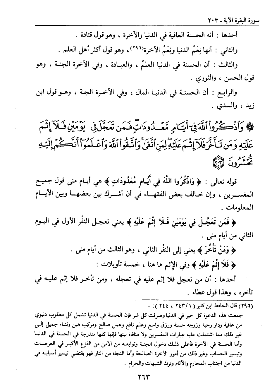 أحدها: أنهم كانوا إذا فرغوا من حجهم في الجاهلية جلسوا في منى حَلَقاً وافتخروا بمناقب آبائهم , فأنزل الله تعالى ذكره {فَاذْكُرُواْ اللهَ كَذِكْرِكُمْءَابآءَكُمْ أَوْ أَشَدَّ ذِكْراً} , وهذا قول مجاهد , وقتادة. والثاني: أن معناه , فاذكروا الله كذكركم الأبناء الصغار للآباء , إذا قالوا: أبَهْ أُمَّه , وهذا قول عطاء , والضحاك. والثالث: أنهم كانوا يدعون , فيقول الواحد منهم: اللهم إن أبي كان عظيم الجفنة , عظيم القبّة , كثير المال , فاعطني مثل ما أعطيته , فلا يذكر غير أبيه , فأُمِرُوا بذكر الله , كذكرهم آباءهم , أو أشد ذكراً , وهو قول السدي. قوله تعالى: {وَمِنْهُم مَّن يَقُولُ رَبَّنَآءَاتِنَا فِي الدُّنْيَا حَسَنَةً وَفِي الأَخِرَةِ حَسَنَةً} فيها أربعة تأويلات: أحدها: أنه الحسنة العافية في الدنيا والآخرة , وهو قول قتادة. والثاني: أنها نِعَمُ الدنيا ونِعَمُ الآخرة , وهو قول أكثر أهل العلم. والثالث: أن الحسنة في الدنيا العلمُ , والعبادة , وفي الآخرة الجنة , وهو قول الحسن , والثوري. والرابع: أن الحسنة في الدنيا المال , وفي الآخرة الجنة , وهو قول ابن زيد , والسدي.