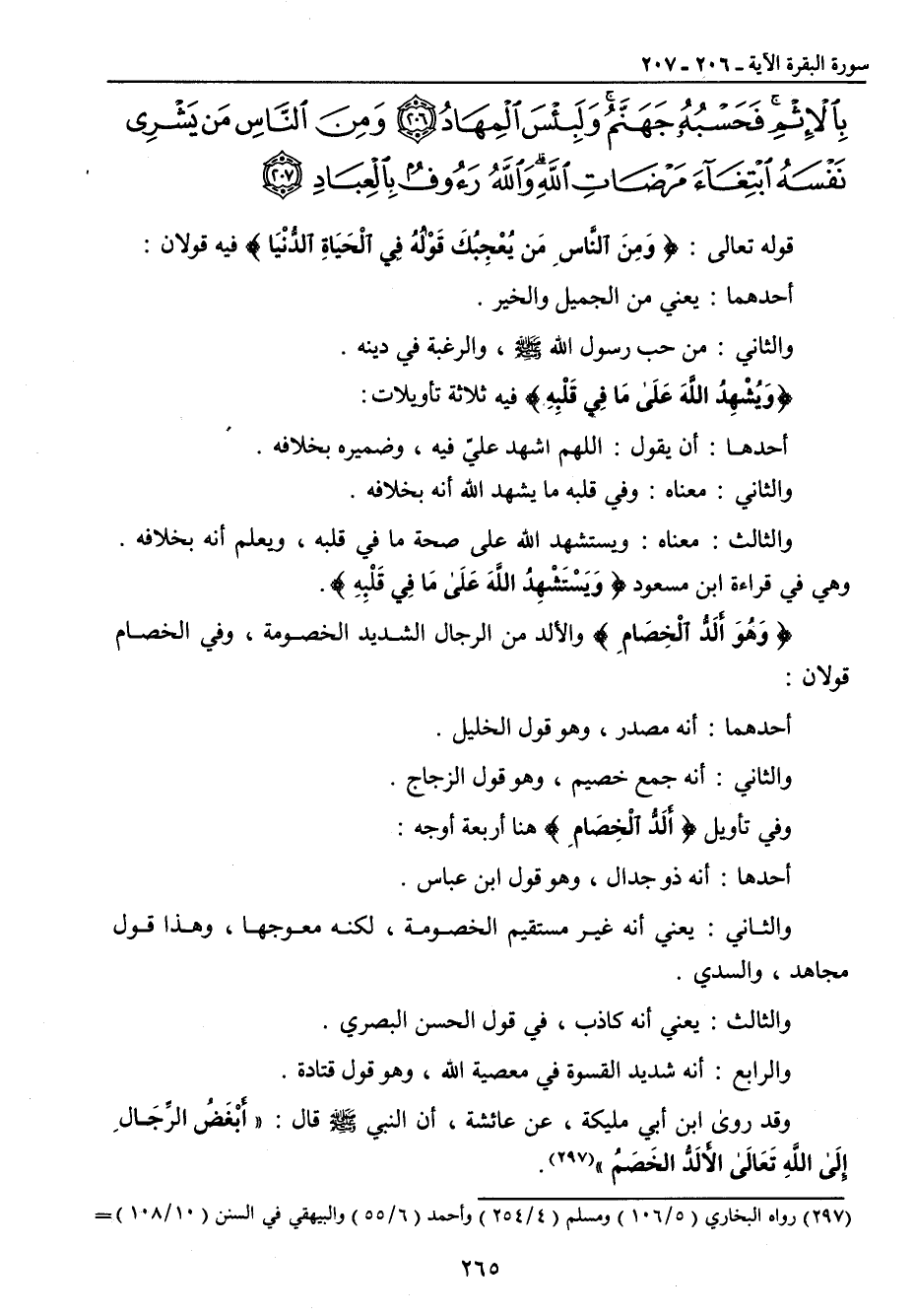 بالإثم فحسبه جهنم ولبئس المهاد ومن الناس من يشري نفسه ابتغاء مرضات الله والله رؤوف بالعباد} قوله تعالى: {وَمِنَ النَّاسِ مَن يُعْجِبُكَ قَوْلُهُ فِي الْحَيَاةٍ الدُّنْيَا} فيه قولان: أحدهما: يعني من الجميل والخير. والثاني: من حب رسول الله صلى الله عليه وسلم , والرغبة في دينه. {وَيُشْهِدُ اللهَ عَلَى مَا فِي قَلْبِهِ} فيه ثلاثة تأويلات: أحدها: أن يقول: اللهم اشهد عليّ فيه , وضميره بخلافه. والثاني: معناه: وفي قلبه ما يشهد الله أنه بخلافه. والثالث: معناه: ويستشهد الله على صحة ما في قلبه , ويعلم أنه بخلافه. وهي في قراءة ابن مسعود {وَيَسْتَشْهِدُ اللهَ عَلَى مَا فِي قَلْبِهِ}. {وَهُوَ أَلَدُّ الْخِصَامِ} والألد من الرجال الشديد الخصومة , وفي الخصام قولان: أحدهما: أنه مصدر , وهو قول الخليل. والثاني: أنه جمع خصيم , وهو قول الزجاج. وفي تأويل: {أَلَدُّ الْخِصَامِ} هنا أربعة أوجه: أحدها: أنه ذو جدال , وهو قول ابن عباس. والثاني: يعني أنه غير مستقيم الخصومة , لكنه معوجها , وهذا قول مجاهد , والسدي. والثالث: يعني أنه كاذب , في قول الحسن البصري. والرابع: أنه شديد القسوة في معصية الله , وهو قول قتادة. وقد روى ابن أبي مليكة , عن عائشة , أن النبي صلى الله عليه وسلم قال: (أَبْغَضُ الرِّجَالِ إِلَى اللهِ تَعَالَى الأَلَدُّ الخَصَمُ).