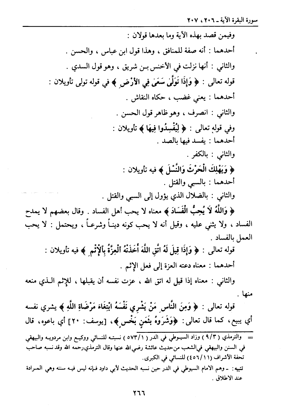 وفيمن قصد بهذه الآية وما بعدها قولان: أحدهما: أنه صفة للمنافق , وهذا قول ابن عباس , والحسن. والثاني: أنها نزلت في الأخنس بن شريق , وهو قول السدي. قوله تعالى: {وَإِذَا تَوَلَّى سَعَى فِي الأرْضِ} في قوله تولى تأويلان: أحدهما: يعني غضب , حكاه النقاش. والثاني: انصرف , وهو ظاهر قول الحسن. وفي قوله تعالى: {لِيُفْسِدَ فِيهَا} تأويلان: أحدهما: يفسد فيها بالصد. والثاني: بالكفر. {وَيُهْلِكَ الْحَرْثَ وَالنَّسْلَ} فيه تأويلان: أحدهما: بالسبي والقتل. والثاني: بالضلال الذي يؤول إلى السبي والقتل. {وَاللهُ لاَ يُحِبُّ الْفَسَادَ} معناه لا يحب أهل الفساد. وقال بعضهم لا يمدح الفساد , ولا يثني عليه , وقيل أنه لا يحب كونه ديناً وشرعاً , ويحتمل: لا يحب العمل بالفساد. قوله تعالى: {وَإِذَا قِيلَ لَهُ اتَّقِ اللهَ أَخَذَتْهُ الْعِزَّةُ بِالإِثْمِ} فيه تأويلان: أحدهما: معناه دعته العزة إلى فعل الإثم. والثاني: معناه إذا قيل له اتق الله , عزت نفسه أن يقبلها , للإثم الذي منعه منها. قوله تعالى: {وَمِنَ النَّاسِ مَن يَشْرِي نَفْسَهُ ابْتِغَآءَ مَرْضَاتِ اللهِ} يشري نفسه أي يبيع , كما قال تعالى: {وَشَرَوهُ بثَمَنٍ بَخْسٍ} [يوسف: 20] أي باعوه , قال