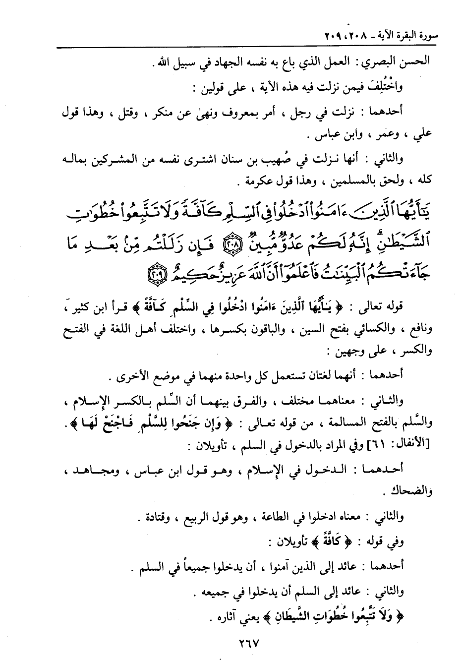 {يا أيها الذين آمنوا ادخلوا في السلم كافة ولا تتبعوا خطوات الشيطان إنه لكم عدو مبين فإن زللتم من بعد ما جاءتكم البينات فاعلموا أن الله عزيز حكيم} قوله تعالى: {يَأَيُّهَا الَّذِينَءَامَنُواْ ادْخُلُواْ فِي السلْمِ كَآفَّةً} قرأ ابن كثير , ونافع , والكسائي بفتح السين , والباقون بكسرها , واختلف أهل اللغة في الفتح والكسر , على وجهين: أحدهما: أنهما لغتان تستعمل كل واحدة منهما في موضع الأخرى. والثاني: معناهما مختلف , والفرق بينهما أن السِّلم بالكسر الإسلام , والسَّلم بالفتح المسالمة , من قوله تعالى: {وَإِن جَنَحُوا لِلسَّلْمِ فَاجْنَحْ لَهَا} [الأنفال: 61] وفي المراد بالدخول في السلم , تأويلان: أحدهما: الدخول في الإسلام , وهو قول ابن عباس , ومجاهد , والضحاك. والثاني: معناه ادخلوا في الطاعة , وهو قول الربيع , وقتادة. وفي قوله: {كَافَّةً} تأويلان: أحدهما: عائد إلى الذين آمنوا , أن يدخلوا جميعاً في السلم. والثاني: عائد إلى السلم أن يدخلوا في جميعه. {وَلاَ تَتَّبِعُوا خُطُوَاتِ الشَّيطَانِ} يعني آثاره.