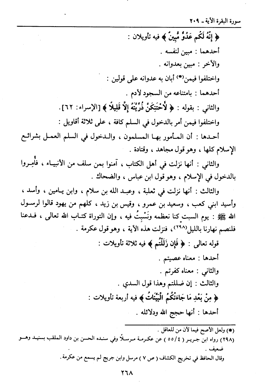 {إِنَّهُ لَكُمْ عَدُوٌّ مُّبِينٌ} فيه تأويلان: أحدهما: مبين لنفسه. والآخر: مبين بعدوانه. واختلفوا فيمن أبان به عدوانه على قولين: أحدهما: بامتناعه من السجود لآدم. والثاني: بقوله: {لأَحْتَنِكَنَّ ذُرِّيَّتَهُ إِلاَّ قَلِيلاً} [الإسراء: 62]. واختلفوا فيمن أمر بالدخول في السلم كافة , على ثلاثة أقاويل: أحدها: أن المأمور بها المسلمون , والدخول في السلم العمل بشرائع الإسلام كلها , وهو قول مجاهد , وقتادة. والثاني: أنها نزلت في أهل الكتاب , آمنوا بمن سلف من الأنبياء , فأُمِروا بالدخول في الإسلام , وهو قول ابن عباس , والضحاك. والثالث: أنها نزلت في ثعلبة , وعبد الله بن سلام , وابن يامين , وأسد , وأسيد ابني كعب , وسعيد بن عمرو , وقيس بن زيد , كلهم من يهود قالوا لرسول الله صلى الله عليه وسلم: يوم السبت كنا نعظمه ونَسْبِتُ فيه , وإن التوراة كتاب الله تعالى , فدعنا فلنصم نهارنا بالليل , فنزلت هذه الآية , وهو قول عكرمة. قوله تعالى: {فَإِن زَلَلْتُم} فيه ثلاثة تأويلات: أحدها: معناه عصيتم. والثاني: معناه كفرتم. والثالث: إن ضللتم وهذا قول السدي. {مِّن بَعْدِ مَا جَآءَتْكُمُ الْبَيِّنَاتُ} فيه أربعة تأويلات: أحدها: أنها حجج الله ودلائله.