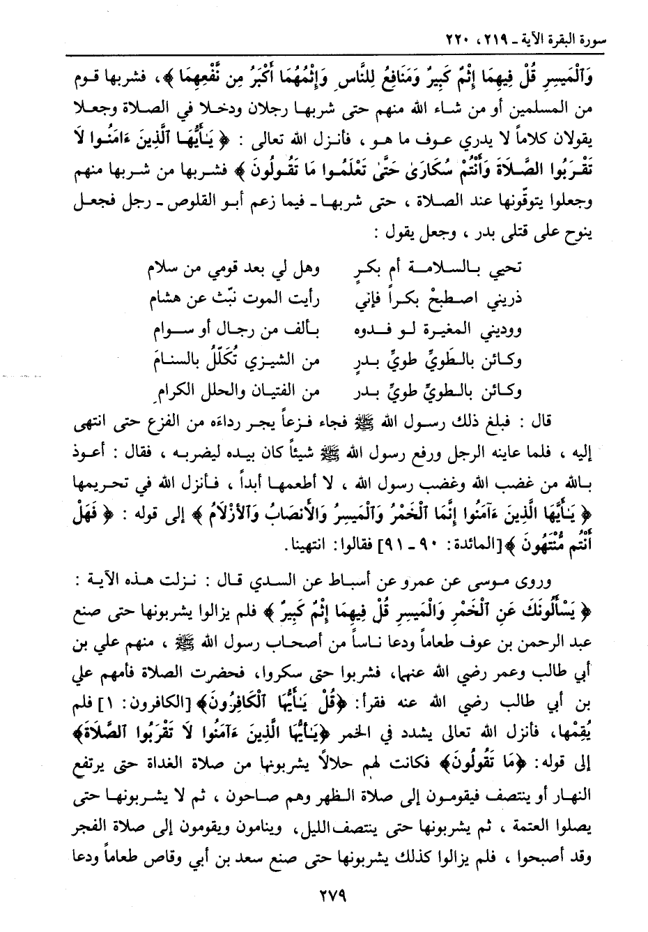 والْمِيِسِرِ قُلْ فِيهِمَا إِثْمٌ كَبِيرٌ وَمَنَاقِعُ لِلنَّاسِ وَإِثْمُهُمَا أَكْبَرُ مِن نَّفْعِهِمَا} , فشربها قوم من المسلمين أو من شاء الله منهم حتى شربها رجلان ودخلا في الصلاة وجعلا يقولان كلاماً لا يدري عوف ما هو , فأنزل الله تعالى: {يا أَيُّهَا الَّذِينَءَامَنُوا لاَ تَقْرَبُوا الَّصلاة وَأَنْتُمْ سُكَارَى حَتَّى تَعْلَمُوا مَا تَقُولُونَ} فشربها من شربها منهم وجعلوا يتوقّونها عند الصلاة , حتى شربها فيما زعم أبو القلوص رجل فجعل ينوح على قتلى بدر , وجعل يقول: