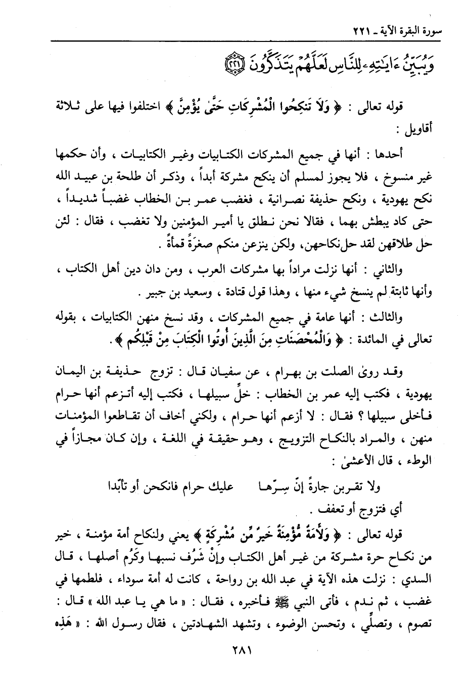 ويبين آياته للناس لعلهم يتذكرون} قوله تعالى: {وَلاَ تَنكِحُوا الْمُشرِكاتِ حَتَّى يُؤمِنَّ} اختلفوا فيها على ثلاثة أقاويل: أحدها: أنها في جميع المشركات الكتابيات وغير الكتابيات , وأن حكمها غير منسوخ , فلا يجوز لمسلم أن ينكح مشركة أبداً , وذكر أن طلحة بن عبيد الله نكح يهودية , ونكح حذيفة نصرانية , فغضب عمر بن الخطاب غضباً شديداً , حتى كاد يبطش بهما , فقالا نحن نطلق يا أمير المؤمنين ولا تغضب , فقال: لئن حل طلاقهن لقد حل نكاحهن , ولكن ينزعن منكم صغرَةً قمأةً. والثاني: أنها نزلت مراداً بها مشركات العرب , ومن دان دين أهل الكتاب , وأنها ثابتة لم نسخ شيء منها , وهذا قول قتادة , وسعيد بن جبير. والثالث: أنها عامة في جميع المشركات , وقد نسخ منهن الكتابيات , بقوله تعالى في المائدة: {وَالْمُحْصَنَاتِ مِنَ الَّذِينَ أُوتُوا الْكِتَابَ مِنْ قَبْلِكُم} وقد روى الصلت بن بهرام , عن سفيان قال: تزوج حذيفة بن اليمان يهودية , فكتب إليه عمر ابن الخطاب , خلِّ سبيلها , فكتب إليه أتزعم أنها حرام فأخلى سبيلها؟ فقال: لا أزعم أنها حرام , ولكني أخاف أن تقاطعوا المؤمنات منهن , والمراد بالنكاح التزويج , وهو حقيقة في اللغة , وإن كان مجازاً في الوطء , قال الأعشى: