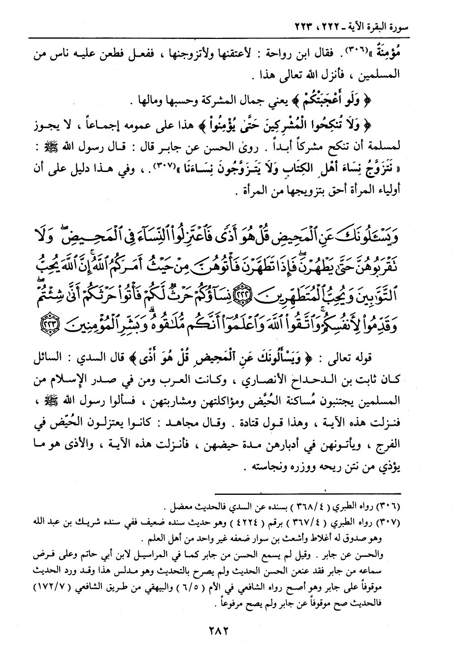 {ويسألونك عن المحيض قل هو أذى فاعتزلوا النساء في المحيض ولا تقربوهن حتى يطهرن فإذا تطهرن فأتوهن من حيث أمركم الله إن الله يحب التوابين ويحب المتطهرين نساؤكم حرث لكم فأتوا حرثكم أنى شئتم وقدموا لأنفسكم واتقوا الله واعلموا أنكم ملاقوه وبشر المؤمنين} قوله تعالى: {وَيَسئَلُونَكَ عَنِ المَحِيضِ قُل هُوَ أَذَىً} قال السدي: السائل كان ثابت بن الدحداح الأنصاري , وكانت العرب ومن في صدر الإسلام من المسلمين يجتنبون مُساكنة الحُيَّض ومؤاكلتهن ومشاربتهن , فسألوا رسول الله صلى الله عليه وسلم , فنزلت هذه الآية , وهذا قول قتادة. وقال مجاهد: كان يعتزلون الحُيَّض في الفرج , ويأتونهن في أدبارهن مدة حيضهن , فأنزلت هذه الآية , والأذى هو ما يؤذي من نتن ريحه ووزره ونجاسته.