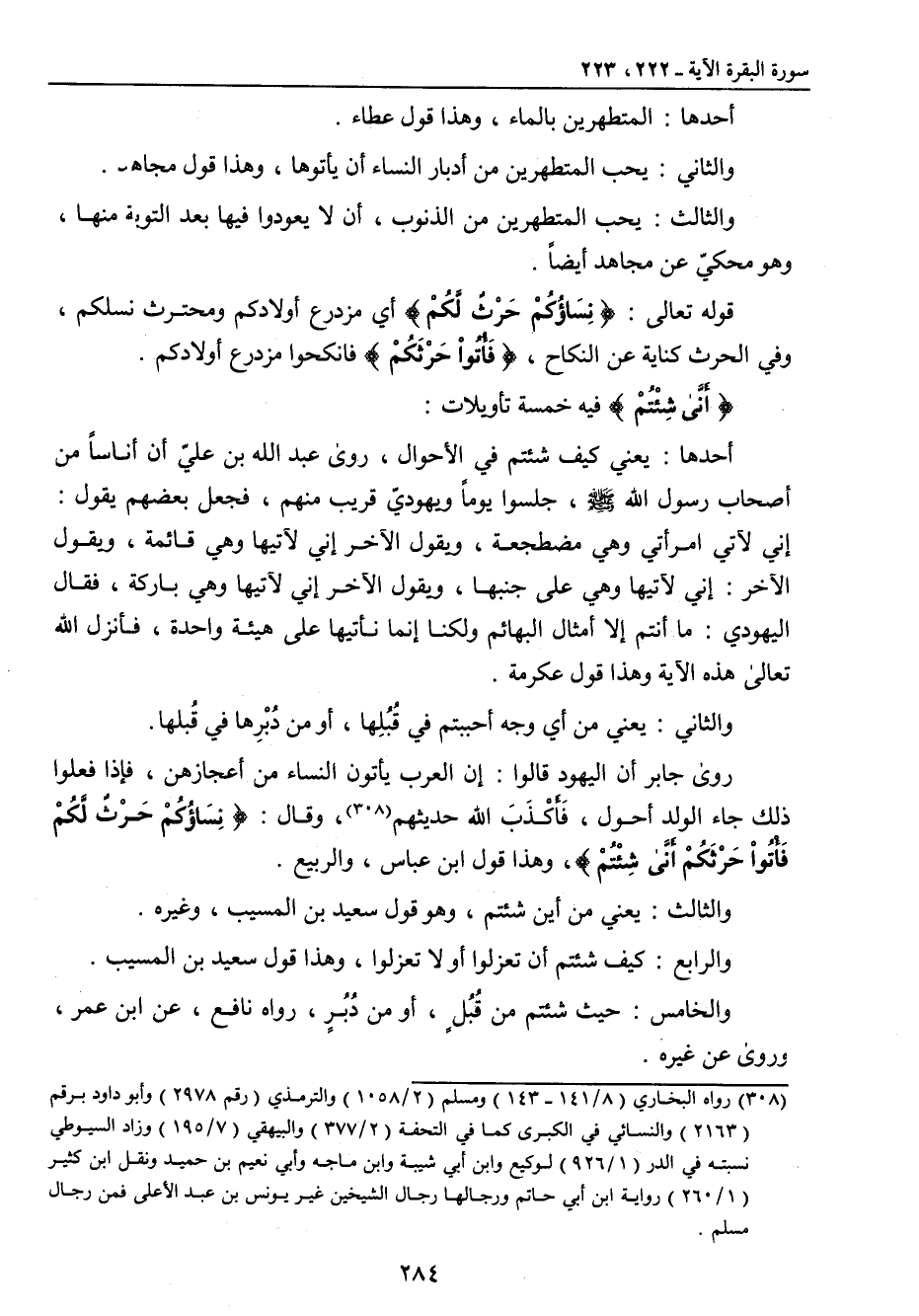 أحدها: المتطهرين بالماء , وهذا قول عطاء. والثاني: يحب المتطهرين من أدبار النساء أن يأتوها , وهذا قول مجاهد. والثالث: يحب المتطهرين من الذنوب , أن لا يعودوا فيها بعد التوبة منها , وهو محكي عن مجاهد أيضاً. قوله تعالى: {نِسَاؤُكُم حَرثٌ لَكُمْ} أي مزدرع أولادكم ومحترث نسلكم , وفي الحرث كناية عن النكاح , {فَأتُوا حَرثَكُمْ} فانكحوا مزدرع أولادكم. {أَنَّى شِئتُمْ} فيه خمسة تأويلات: أحدها: يعني كيف شئتم في الأحوال , روى عبد الله بن علي أن أناساً من أصحاب رسول الله صلى الله عليه وسلم , جلسوا يوماً ويهودي قريب منهم , فجعل بعضهم يقول: إني لآتي امرأتي وهي مضطجعة , ويقول الآخر إني لآتيها وهي قائمة , ويقول الآخر: إني لآتيها وهي على جنبها , ويقول الآخر إني لآتيها وهي باركة , فقال اليهودي: ما أنتم إلا أمثال البهائم ولكنا إنما نأتيها على هيئة واحدة , فأنزل الله تعالى هذه الآية وهذا قول عكرمة. والثاني: يعني من أي وجه أحببتم في قُبِلها , أو من دُبْرِها في قُبلها. روى جابر أن اليهود قالوا: إن العرب يأتون النساء من أعجازهن , فإذا فعلوا ذلك جاء الولد أحول , فَأَكْذَبَ الله حديثهم وقال: {نِسَاؤُكُم حَرثٌ لَكُمْ فَأتُوا حَرثَكُمْ أَنَّى شِئتُمْ} , وهذا قول ابن عباس , والربيع. والثالث: يعني من أين شئتم وهو قول سعيد بن المسيب وغيره. والرابع: كيف شئتم أن تعزلوا أو لا تعزلوا , وهذا قول سعيد بن المسيب. والخامس: حيث شئتم من قُبُلٍ , أو من دُبُرٍ , رواه نافع , عن ابن عمر وروى عن غيره.