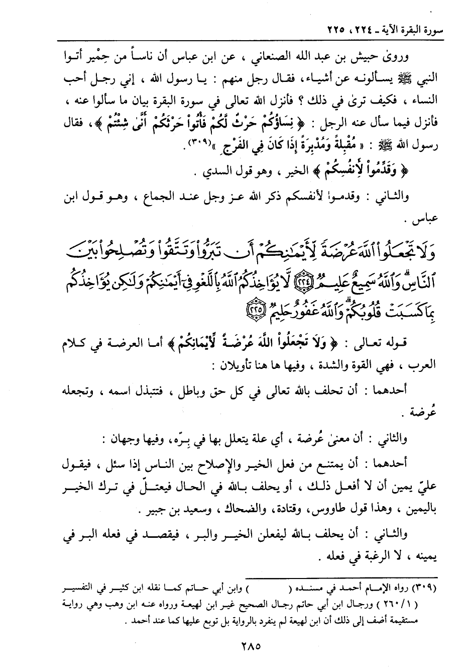 {ولا تجعلوا الله عرضة لأيمانكم أن تبروا وتتقوا وتصلحوا بين الناس والله سميع عليم لا يؤاخذكم الله باللغو في أيمانكم ولكن يؤاخذكم بما كسبت قلوبكم والله غفور حليم} قوله تعالى: {وَلاَ تَجْعَلُواْ اللَّهَ عُرْضَةً لأَيْمَانِكُمْ} أما العرضة في كلام العرب , فهي القوة والشدة , وفيها ها هنا تأويلان: أحدهما: أن تحلف بالله تعالى في كل حق وباطل , فتتبذل اسمه , وتجعله عُرضة. والثاني: أن معنى عُرضة , أي علة يتعلل بها في بِرّه , وفيها وجهان: أحدهما: أن يمتنع من فعل الخير والإصلاح بين الناس إذا سئل , فيقول عليّ يمين أن لا أفعل ذلك , أو يحلف بالله في الحال فيعتلّ في ترك الخير باليمين , وهذا قول طاووس , وقتادة , والضحاك , وسعيد بن جبير. والثاني: أن يحلف بالله ليفعلن الخير والبر , فيقصد في فعله البر في يمينه , لا الرغبة في فعله.
