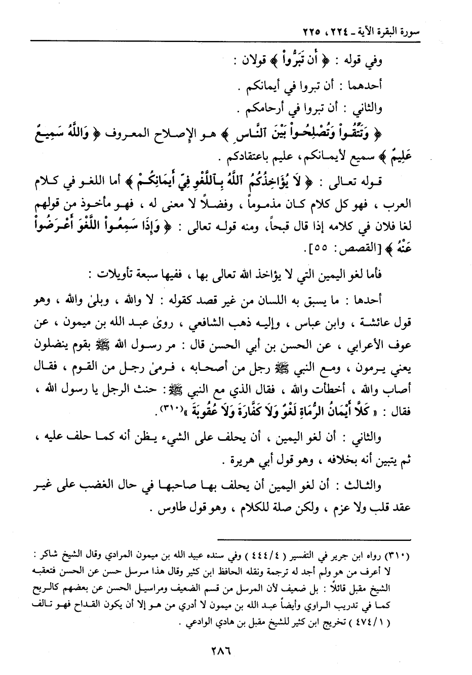 وفي قوله: {أَن تَبَرُّواْ} قولان: أحدهما: أن تبروا في أيمانكم. والثاني: أن تبروا في أرحامكم. {وَتَتَقُواْ وَتُصْلِحُواْ بَيْنَ النَّاسِ} هو الإصلاح المعروف {وَاللَّهُ سَمِيعٌ عَلِيمٌ} سميع لأيمانكم , عليم باعتقادكم. قوله تعالى: {لاَّ يُؤَاخِذُكُمُ اللَّهُ بِالَّلغوِ فيِ أَيْمانِكُم} أما اللغو في كلام العرب , فهو كل كلام كان مذموماً , وفضلا لا معنى له , فهو مأخوذ من قولهم لغا فلان في كلامه إذا قال قبحاً , ومنه قوله تعالى: {وَإِذَا سَمِعُواْ اللَّغْوَ أَعْرَضُواْ عَنْهُ} [القصص: 55]. فأما لغو اليمين التي لا يؤاخذ الله تعالى بها , ففيها سبعة تأويلات: أحدها: ما يسبق به اللسان من غير قصد كقوله: لا والله , وبلى والله , وهو قول عائشة , وابن عباس , وإليه ذهب الشافعي , روى عبد الله بن ميمون , عن عوف الأعرابي , عن الحسن بن أبي الحسن قال: مر رسول الله صلى الله عليه وسلم بقوم ينضلون يعني يرمون , ومع النبي صلى الله عليه وسلم رجل من أصحابه , فرمى رجل من القوم , فقال أصاب والله , أخطأت والله , فقال الذي مع النبي صلى الله عليه وسلم: حنث الرجل يا رسول الله , فقال: (كَلاَّ أَيْمَانُ الرَُمَاةِ لَغُّوٌ وَلاَ كَفَّارَةَ وَلاَ عُقٌوبَةَ). والثاني: أن لغو اليمين , أن يحلف على الشيء يظن أنه كما حلف عليه , ثم يتبين أنه بخلافه , وهو قول أبي هريرة. والثالث: أن لغو اليمين أن يحلف بها صاحبها في حال الغضب على غير عقد قلب ولا عزم , ولكن صلة للكلام , وهو قول طاوس.