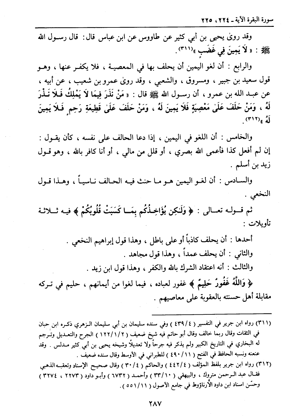 وقد روى يحيى بن أبي كثير عن طاووس عن ابن عباس قال: قال رسول الله صلى الله عليه وسلم: (لاَ يَمِينَ فِي غَضَبٍ). والرابع: أن لغو اليمين أن يحلف بها في المعصية , فلا يكفر عنها , وهو قول سعيد بن جبير , ومسروق , والشعبي , وقد روى عمرو بن شعيب , عن أبيه , عن عبد الله بن عمرو , أن رسول الله صلى الله عليه وسلم قال: (مَنْ نَذَرَ فِيمَا لاَ يَمْلِكُ فَلاَ نَذْرَ لَهُ , وَمَنْ حَلَفَ عَلَى مَعْصِيَةٍ فَلاَ يَمِينَ لَهُ , وَمَنْ حَلَفَ عَلَى قَطِيعَةِ رَحِمٍ فَلاَ يَمِينَ لَهُ). والخامس: أن اللغو في اليمين , إذا دعا الحالف على نفسه , كأن يقول: إن لم أفعل كذا فأعمى الله بصري , أو قلل من مالي , أو أنا كافر بالله , وهو قول زيد بن أسلم. والسادس: أن لغو اليمين هو ما حنث فيه الحالف ناسياً , وهذا قول النخعي. ثم قوله تعالى: {وَلَكِن يُؤَاخِذُكُم بِمَا كَسَبَتْ قُلُوبُكُمْ} فيه ثلاثة تأويلات: أحدها: أن يحلف كاذباً أو على باطل , وهذا قول إبراهيم النخعي. والثاني: أن يحلف عمداً , وهذا قول مجاهد. والثالث: أنه اعتقاد الشرك بالله والكفر , وهذا قول ابن زيد. {وَاللهُ غَفُورٌ حَلِيمٌ} غفور لعباده , فيما لغوا من أيمانهم , حليم في تركه مقابلة أهل حسنته بالعقوبة على معاصيهم.