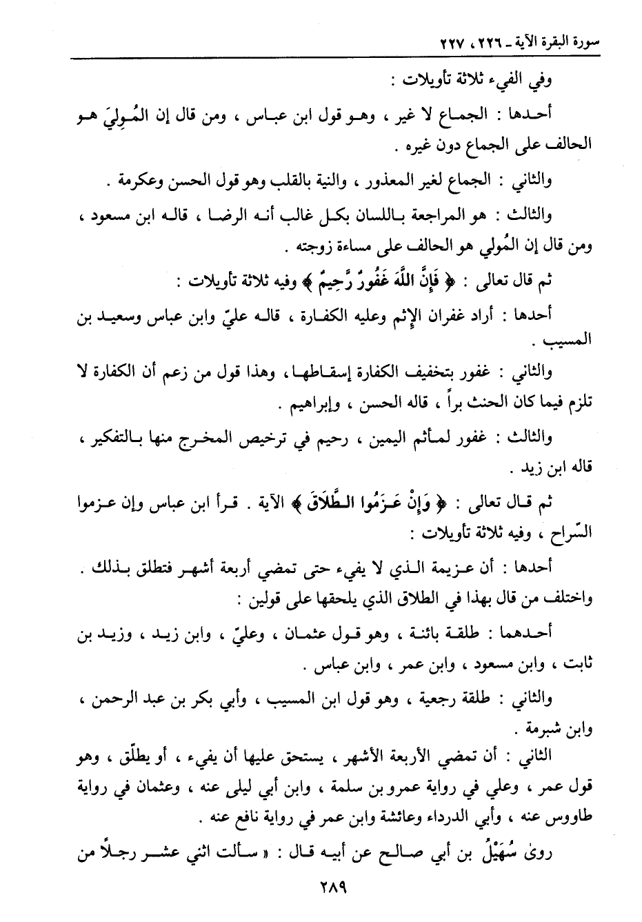 وفي الفيء ثلاثة تأويلات: أحدها: الجماع لا غير , وهو قول ابن عباس , ومن قال إن المُوِلَي هو الحالف على الجماع دون غيره. والثاني: الجماع لغير المعذور , والنية بالقلب وهو قول الحسن وعكرمة. والثالث: هو المراجعة باللسان بكل غالب أنه الرضا , قاله ابن مسعود , ومن قال إن المُولي هو الحالف على مساءة زوجته. ثم قال تعالى: {فَإِنَّ اللهَ غَفُورٌ رَّحِيمٌ} وفيه ثلاثة تأويلات: أحدها: أراد غفران الإثم وعليه الكفارة , قاله عليّ وابن عباس وسعيد بن المسيب. والثاني: غفور بتخفيف الكفارة إسقاطها , وهذا قول من زعم أن الكفارة لا تلزم فيما كان الحنث براً , قاله الحسن , وإبراهيم. والثالث: غفور لمأثم اليمين , رحيم في ترخيص المخرج منها بالتفكير , قاله ابن زيد. ثم قال تعالى: {وَإِنْ عَزَمُوا الطَّلاَقَ} الآية. قرأ ابن عباس وإن عزموا السّراح , وفيه ثلاثة تأويلات: أحدها: أن عزيمة الذي لا يفيء حتى تمضي أربعة أشهر فتطلق بذلك. واختلف من قال بهذا في الطلاق الذي يلحقها على قولين: أحدهما: طلقة بائنة , وهو قول عثمان , وعليّ , وابن زيد , وزيد بن ثابت , وابن مسعود , وابن عمر , وابن عباس. والثاني: طلقة رجعية , وهو قول ابن المسيب , وأبي بكر بن عبد الرحمن , وابن شبرمة. الثاني: أن تمضي الأربعة الأشهر , يستحق عليها أن يفيء , أو يطلق , وهو قول عمر , وعلي في رواية عمرو بن سلمة , وابن أبي ليلى عنه , وعثمان في رواية طاووس عنه , وأبي الدرداء وعائشة وابن عمر في رواية نافع عنه. روى سُهَيْلُ بن أبي صالح عن أبيه قال: (سألت اثني عشر رجلاً من