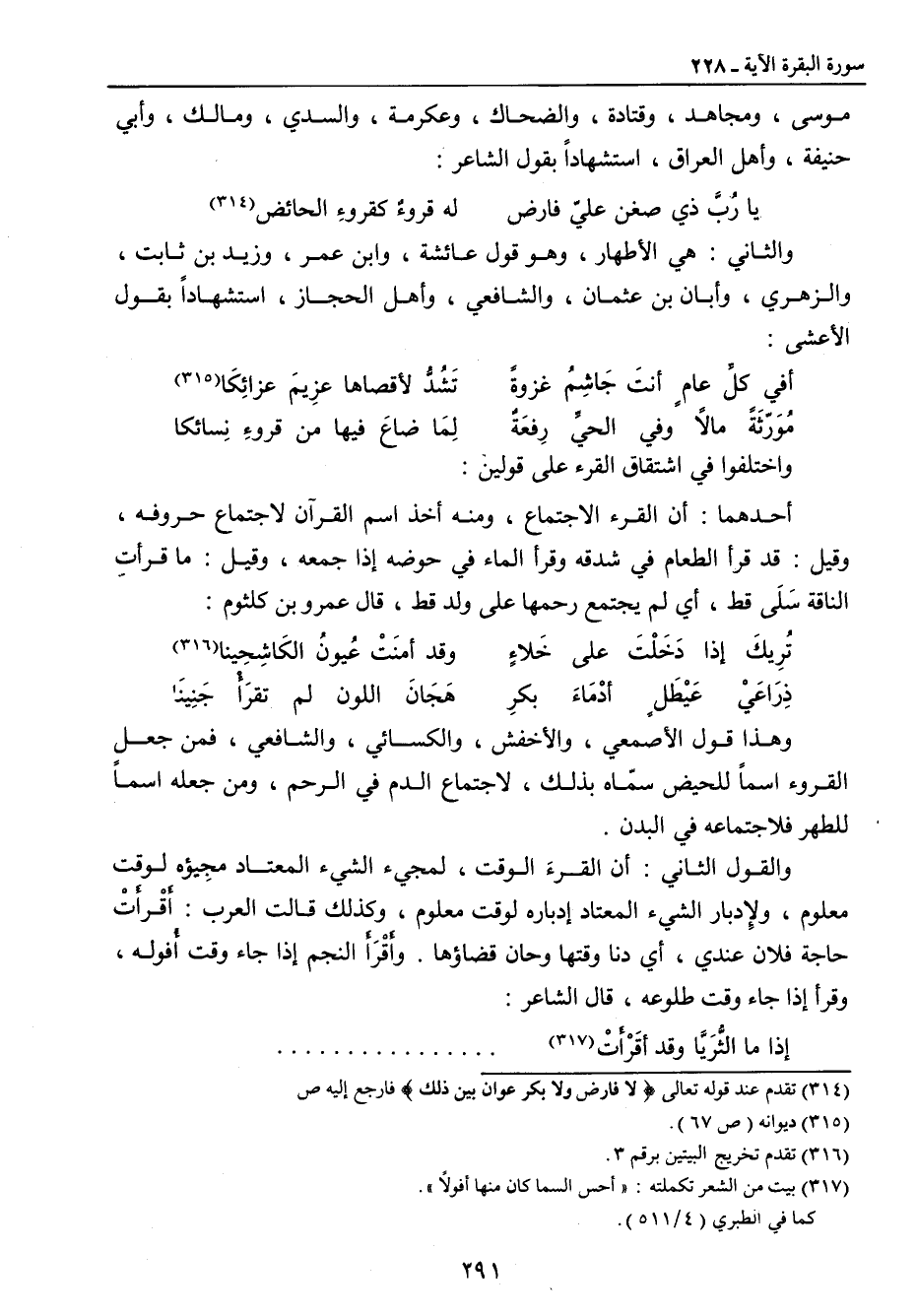 وهذا قول الأصمعي , والأخفش , والكسائي , والشافعي , فمن جعل القروء اسماً للحيض سماه بذلك , لاجتماع الدم في الرحم , ومن جعله اسماً للطهر فلاجتماعه في البدن. والقول الثاني: أن القرء الوقت , لمجيء الشيء المعتاد مجِيؤه لوقت معلوم , ولإدبار الشيء المعتاد إدباره لوقت معلوم , وكذلك قالت العرب: أَقْرأَتْ حاجة فلان عندي , أي دنا وقتها وحان قضاؤها. وأَقْرَأَ النجم إذا جاء وقت أُفوله , وقرأ إذا جاء وقت طلوعه , قال الشاعر: