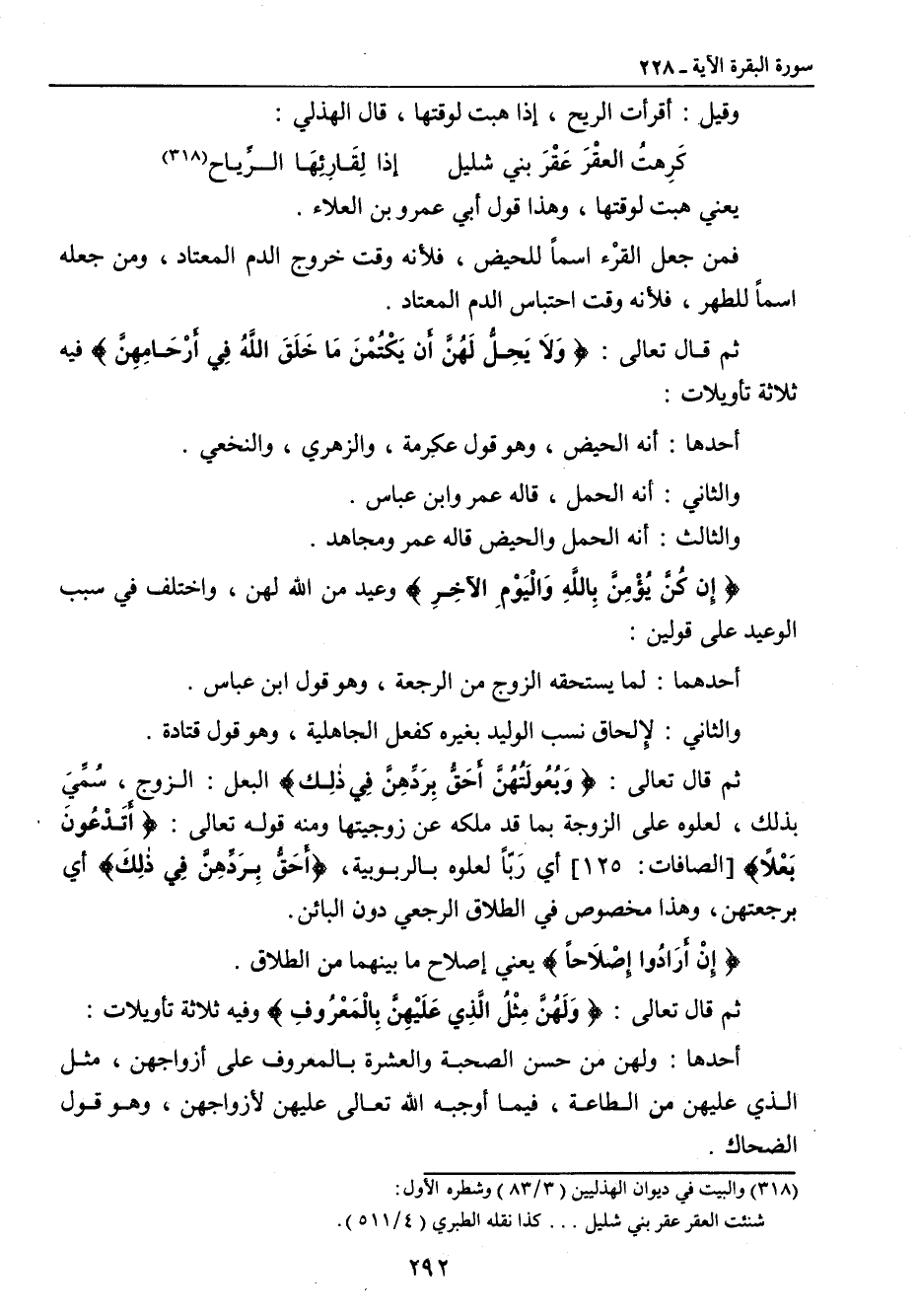 يعني هبت لوقتها , وهذا قول أبي عمرو بن العلاء. فمن جعل القرْء اسماً للحيض , فلأنه وقت خروج الدم المعتاد , ومن جعله اسماً للطهر , فلأنه وقت احتباس الدم المعتاد. ثم قال تعالى: {وَلاَ يَحِلُّ لَهُنَّ أَن يَكْتُمْنَ مَا خَلَقَ اللهُ في أَرْحَامِهِنَّ} فيه ثلاثة تأويلات: أحدها: أنه الحيض , وهو قول عكرمة , والزهري , والنخعي. والثاني: أنه الحمل , قاله عمر وابن عباس. والثالث: أنه الحمل والحيض قاله عمر ومجاهد. {إِن كُنَّ يُؤْمِنَّ بِاللهِ وَالْيَوْمِ الآخِرِ} وعيد من الله لهن , واختلف في سبب الوعيد على قولين: أحدهما: لما يستحقه الزوج من الرجعة , وهو قول ابن عباس. والثاني: لإلحاق نسب الوليد بغيره كفعل الجاهلية , وهو قول قتادة. ثم قال تعالى: {وَبُعُولَتُهُنَّ أَحَقُّ بِرَدِّهِنَّ في ذَلِكَ} البعل: الزوج , سُمِّيَ بذلك , لعلوه على الزوجة بما قد ملكه عن زوجيتها ومنه قوله تعالى: {أَتَدْعُونَ بَعْلاً} [الصافات: 125] أي رَبّاً لعلوه بالربوبية , {أَحَقُّ بِرَدِّهِنَّ فِي ذلِكَ} أي برجعتهن , وهذا مخصوص في الطلاق الرجعي دون البائن. {إِنْ أَرَادُوا إِصْلاَحاً} يعني إصلاح ما بينهما من الطلاق. ثم قال تعالى: {وَلَهُنَّ مِثْلُ الَّذِي عَلَيْهِنَّ بِالْمَعْرُوفِ} وفيه ثلاثة تأويلات: أحدها: ولهن من حسن الصحبة والعشرة بالمعروف على أزواجهن , مثل الذي عليهن من الطاعة , فيما أوجبه الله تعالى عليهن لأزواجهن , وهو قول الضحاك.