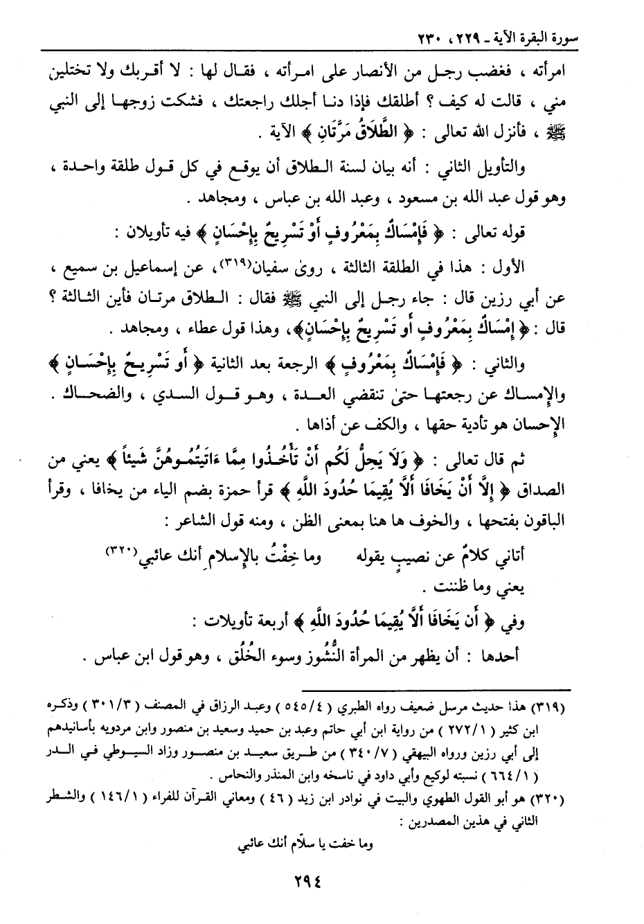 امرأته , فغضب رجل من الأنصار على امرأته , فقال لها: لا أقربك ولا تختلين مني , قالت له كيف؟ أطلقك فإذا دنا أجلك راجعتك , فشكت زوجها إلى النبي صلى الله عليه وسلم , فأنزل الله تعالى: {الطَّلاَقُ مَرَّتَانِ} الآية. والتأويل الثاني: أنه بيان لسنة الطلاق أن يوقع في كل قول طلقة واحدة , وهو قول عبد الله بن مسعود , وعبد الله بن عباس , ومجاهد. قوله تعالى: {فَإِمْسَاكُ بِمَعْرُوفٍ أَوْ تَسْرِيحُ بِإِحْسَانٍ} فيه تأويلان: الأول: هذا في الطلقة الثالثة , روى سفيان , عن إسماعيل بن سميع , عن أبي رزين قال: جاء رجل إلى النبي صلى الله عليه وسلم فقال: الطلاق مرتان فأين الثالثة؟ قال: {فَإِمْسَاكُ بِمَعْرُوفٍ أَوْ تَسْرِيحُ بِإِحْسَانٍ} , وهذا قول عطاء , ومجاهد. والثاني: {فَإِمْسَاكُ بِمَعْرُوفٍ} الرجعة بعد الثانية {أَوْ تَسْرِيحُ بِإِحْسَانٍ} والإمساك عن رجعتها حتى تنقضي العدة , وهو قول السدي , والضحاك. الإحسان هو تأدية حقها , والكف عن أذاها. ثم قال تعالى: {وَلاَ يَحِلُّ لَكُمْ أَن تَأْخُذُوا مِمَّآءَاتَيْتُمُوهُنَّ شَيْئاً} يعني من الصداق {إِلاَّ أَن يَخَافَا أَلاَّ يُقِيَما حُدُودَ اللهِ} قرأ حمزة بضم الياء من يخافا , وقرأ الباقون بفتحها , والخوف ها هنا بمعنى الظن , ومنه قول الشاعر: