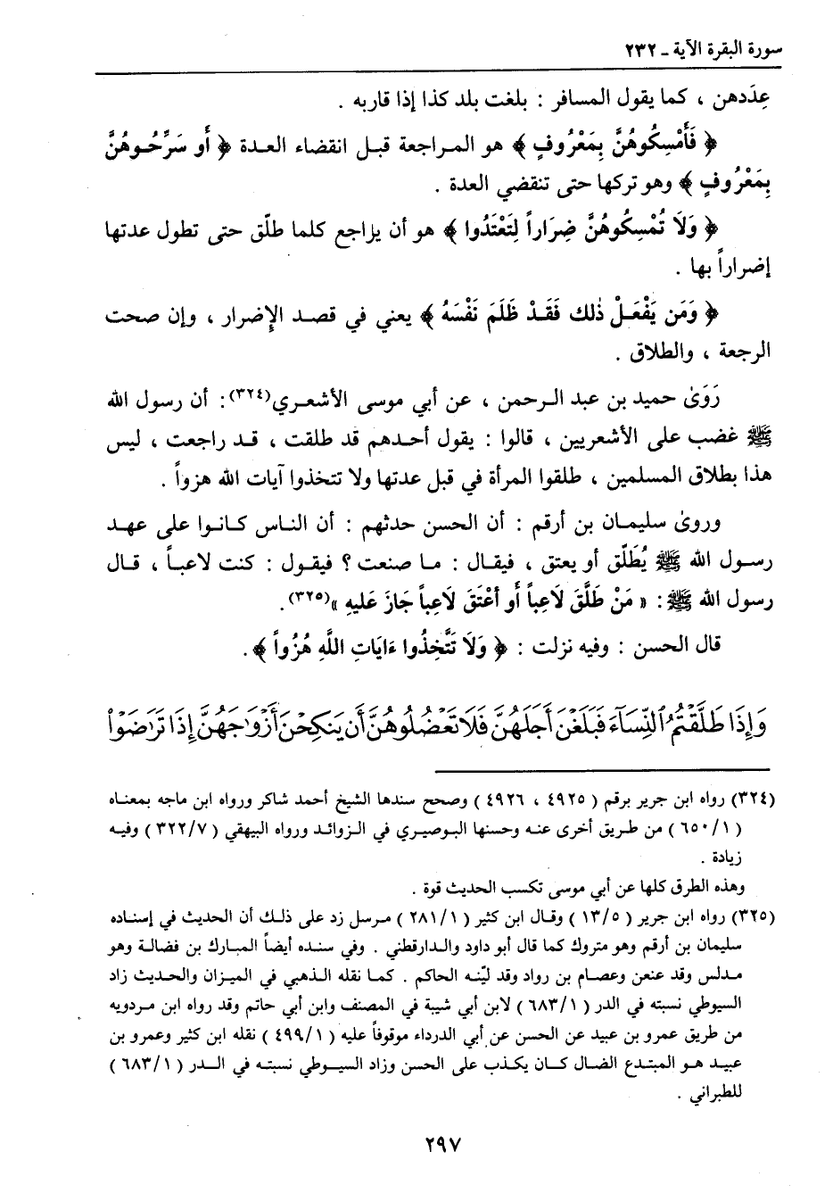عِدَدهن , كما يقول المسافر: بلغت بلد كذا إذا قاربه. {فَأَمْسِكُوهُنَّ بِمَعْرُوفٍ} هو المراجعة قبل انقضاء العدة {أَوْ سَرِّحُوهُنَّ بِمَعْرُوفٍ} وهو تركها حتى تنقضي العدة. {وَلاَ تُمْسِكُوهُنَّ ضِرَاراً لّتَعْتَدُواْ} هو أن يراجع كلما طلّق حتى تطول عدتها إضراراً بها. {وَمَن يَفْعَلْ ذَلِكَ فَقَدْ ظَلَمَ نَفْسَهُ} يعني في قصد الإضرار , وإن صحت الرجعة , والطلاق. رَوَى حميد بن عبد الرحمن , عن أبي موسى الأشعري: أن رسول الله صلى الله عليه وسلم غضب على الأشعريين , قالوا: يقول أحدهم قد طلقت , قد راجعت , ليس هذا بطلاق المسلمين , طلقوا المرأة في قبل عدتها ولا تتخذوا آيات الله هزواً. وروى سليمان بن أرقم: أن الحسن حدثهم: أن الناس كانوا على عهد رسول الله صلى الله عليه وسلم يُطَلّق أو يعتق , فيقال: ما صنعت؟ فيقول: كنت لاعباً , قال رسول الله صلى اله عليه وسلم: (مَنْ طَلَّقَ لاَعِباً أَو أعْتَقَ لاَعِباً جَازَ عَليهِ). قال الحسن: وفيه نزلت: {وَلاَ تَتَّخِذُواءَايَاتِ اللهِ هُزُواً}.