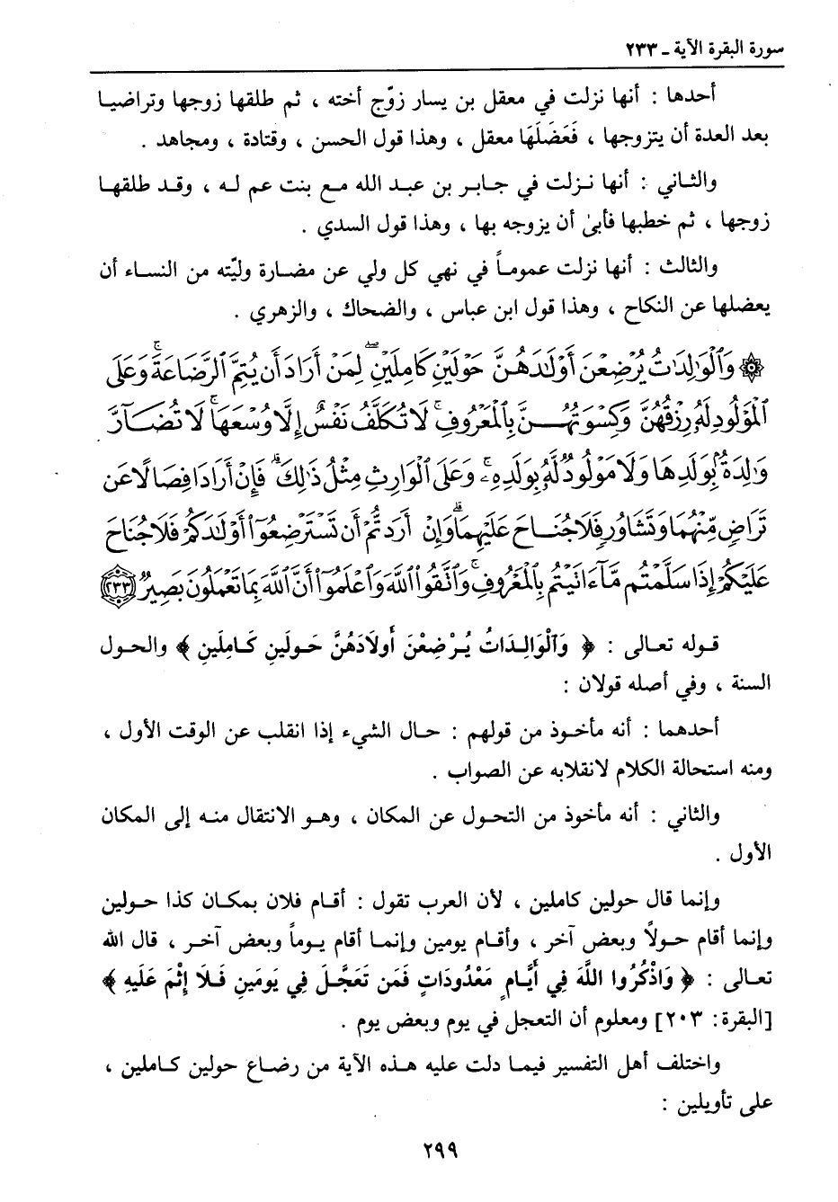 {والوالدات يرضعن أولادهن حولين كاملين لمن أراد أن يتم الرضاعة وعلى المولود له رزقهن وكسوتهن بالمعروف لا تكلف نفس إلا وسعها لا تضار والدة بولدها ولا مولود له بولده وعلى الوارث مثل ذلك فإن أرادا فصالا عن تراض منهما وتشاور فلا جناح عليهما وإن أردتم أن تسترضعوا أولادكم فلا جناح عليكم إذا سلمتم ما آتيتم بالمعروف واتقوا الله واعلموا أن الله بما تعملون بصير} قوله تعالى: {وَالْوَلِدَاتُ يُرْضِعْنَ أَوْلَدَهُنَّ حَوْلَينِ كَامِلَيْنِ} والحول السنة , وفي أصله قولان: أحدهما: أنه مأخوذ من قولهم: حال الشيء إذا انقلب عن الوقت الأول , ومنه استحالة الكلام لانقلابه عن الصواب. والثاني: أنه مأخوذ من التحول عن المكان , وهو الانتقال منه إلى المكان الأول. وإنما قال حولين كاملين , لأن العرب تقول: أقام فلان بمكان كذا حولين وإنما أقام حولاً وبعض آخر , وأقام يومين وإنما أقام يوماً وبعض آخر , قال الله تعالى: {وَاذْكُرُوا اللهَ في أَيَّامٍ مَعْدُودَاتٍ فَمَن تَعَجَّلَ فِي يَومَينِ فَلاَ إِثْمَ عَلَيهِ} [البقرة: 203] ومعلوم أن التعجل في يوم وبعض يوم. واختلف أهل التفسير فيما دلت عليه هذه الآية من رضاع حولين كاملين , على تأويلين: