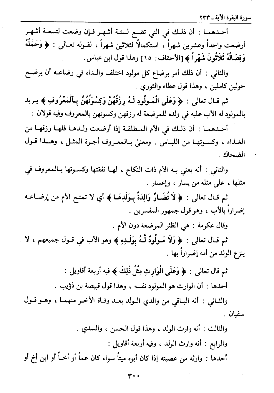أحدهما: أن ذلك في التي تضع لستة أشهر فإن وضعت لتسعة أشهر أرضعت واحداً وعشرين شهراً , استكمالاً لثلاثين شهراً , لقوله تعالى: {وَحَمْلُهُ وَفِصَالُهُ ثَلاَثُونَ شَهْراً} [الأحقاف: 15] وهذا قول ابن عباس. والثاني: أن ذلك أمر برضاع كل مولود اختلف والداه في رضاعه أن يرضع حولين كاملين , وهذا قول عطاء والثوري. ثم قال تعالى: {وَعَلَى الْمَولُودِ لَهُ رِزْقُهُنَّ وَكِسْوَتُهُنَّ بِالْمَعْرُوفِ} يريد بالمولود له الأب عليه في ولده للمرضعة له رزقهن وكسوتهن بالمعروف وفيه قولان: أحدهما: أن ذلك في الأم المطلقة إذا أرضعت ولدها فلها رزقها من الغذاء , وكسوتها من اللباس. ومعنى بالمعروف أجرة المثل , وهذا قول الضحاك. والثاني: أنه يعني به الأم ذات النكاح , لها نفقتها وكسوتها بالمعروف في مثلها , على مثله من يسار , وإعسار. ثم قال تعالى: {لاَ تُضَار وَالِدَةٌ بِوَلَدِهَا} أي لا تمتنع الأم من إرضاعه إضراراً بالأب , وهو قول جمهور المفسرين. وقال عكرمة: هي الظئر المرضعة دون الأم. ثم قال تعالى: {وَلاَ مَولُودٌ لَّهُ بِوَلَدِهِ} وهو الأب في قول جميعهم , لا ينزع الولد من أمه إضراراً بها. ثم قال تعالى: {وَعَلَى الْوَارِثِ مِثْلُ ذلِكَ} فيه أربعة أقاويل: أحدها: أن الوارث هو المولود نفسه , وهذا قول قبيصة بن ذؤيب. والثاني: أنه الباقي من والدي بعد وفاة الآخر منهما , وهو قول سفيان. والثالث: أنه وارث الولد , وهذا قول الحسن , والسدي. والرابع: أنه وارث الولد , وفيه أربعة أقاويل: أحدها: وارثه من عصبته إذا كان أبوه ميتاً سواء كان عماً أو أخاً أو ابن أخ أو