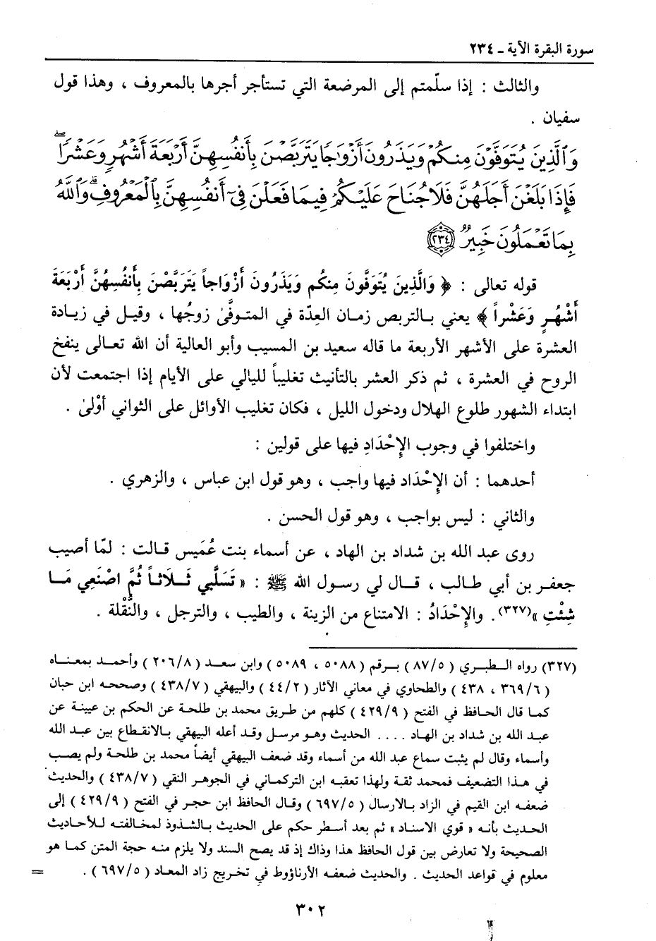 {والذين يتوفون منكم ويذرون أزواجا يتربصن بأنفسهن أربعة أشهر وعشرا فإذا بلغن أجلهن فلا جناح عليكم فيما فعلن في أنفسهن بالمعروف والله بما تعملون خبير} قوله تعالى: {وَالَّذِينَ يُتَوَفَّونَ مِنكُم وَيَذَرُونَ أَزْوَاجاً يَتَرَبَّصْنَ بِأَنفُسِهُنَّ أَرْبَعَةَ أَشْهُرٍ وَعَشْراً} يعني بالتربص زمان العِدّة في المتوَّفى زوجُها , وقيل في زيادة العشرة على الأشهر الأربعة ما قاله سعيد بن المسيب وأبو العالية أن الله تعالى ينفخ الروح في العشرة , ثم ذكر العشر بالتأنيث تغليباً لليالي على الأيام إذا اجتمعت لأن ابتداء الشهور طلوع الهلال ودخول الليل , فكان تغليب الأوائل على الثواني أوْلى. واختلفوا في وجوب الإِحْدَادِ فيها على قولين: أحدهما: أن الإِحْدَاد فيها واجب , وهو قول ابن عباس , والزهري. والثاني: ليس بواجب , وهو قول الحسن. روى عبد الله ابن شداد بن الهاد , عن أسماء بنت عُمَيس قالت: لمّا أصيب جعفر بن أبي طالب , قال لي رسول الله صلى الله عليه وسلم: (تَسَلَّبي ثَلاَثاً ثُمَّ اصْنَعِي مَا شِئْتِ). والإِحْدَادُ: الامتناع من الزينة , والطيب , والترجل , والنُّقْلة.
