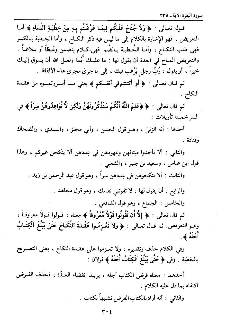 قوله تعالى: {وَلاَ جُنَاحَ عَلَيكُم فِيمَا عَرَّضْتُم بِهِ مِنْ خِطْبَةِ النِّسَاءِ} أما التعريض , فهو الإشارة بالكلام إلى ما ليس فيه ذكر النكاح , وأما الخِطبة بالكسر فهي طلب النكاح , وأما الخُطبة بالضَّمِ فهي كلام يتضمن وعْظاً أو بلاغاً. والتعريض المباح في العدة أن يقول لها: ما عليك أَيْمة ولعل الله أن يسوق إليك خيراً , أو يقول: رُبَّ رجلٍ يَرْغب فيك , غلى ما جرى مجرى هذه الألفاظ. ثم قال تعالى: {أو أكننتم في أنفسكم} يعني ما أسررتموه من عقدة النكاح. ثم قال تعالى: {عَلِمَ اللهُ أَنَّكُمْ سَتَذْكُرُونَهُنَّ وَلَكِن لاَّ تُوَاعِدُوهُنَّ سِرّاً} في السر خمسة تأويلات: أحدها: أنه الزنى , وهو قول الحسن , وأبي مجلز , والسدي , والضحاك وقتادة. والثاني: ألا تأخذوا ميثاقهن وعهودهن في عِددهن ألا ينكحن غيركم , وهذا قول ابن عباس , وسعيد بن جبير , والشعبي. والثالث: ألا تنكحوهن في عِددهن سراً , وهو قول عبد الرحمن بن زيد. والرابع: أن يقول لها: لا تفوتني نفسك , وهو قول مجاهد. والخامس: الجماع , وهو قول الشافعي. ثم قال تعالى: {إلا أن تقولوا قولاً معروفاً} معناه: قولوا قولاً معروفاً , وهو التعريض. ثم قال تعالى: {وَلاَ تَعْزِمُوا عُقْدَةَ النِّكَاحَ حَتَى يَبْلُغَ الْكِتَابُ أَجَلَهُ}. وفي الكلام حذف وتقديره: ولا تعزموا على عقدة النكاح , يعني التصريح بالخطبة. وفي {حَتَّى يَبْلُغَ الْكِتَابُ أَجَلَهُ} قولان: أحدهما: معناه فرض الكتاب أجله , يريد انقضاء العدّة , فحذف الفرض اكتفاء بما دل عليه الكلام. والثاني: أنه أراد بالكتاب الفرض تشبيهاً بكتاب.