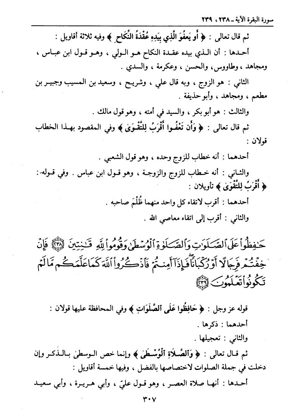 ثم قال تعالى: {أَو يَعفُوَ الَّذِي بِيَدِهِ عُقْدَةُ النِّكَاحِ} وفيه ثلاثة أقاويل: أحدها: أن الذي بيده عقدة النكاح هو الولي , وهو قول ابن عباس , ومجاهد , وطاووس , والحسن , وعكرمة , والسدي. الثاني: هو الزوج , وبه قال علي , وشريح , وسعيد بن المسيب وجبير بن مطعم , ومجاهد , وأبو حذيفة. والثالث: هو أبو بكر , والسيد في أمته , وهو قول مالك. ثم قال تعالى: {وَأَن تَعْفُوا أَقْرَبُ لِلتَّقْوَى} وفي المقصود بهذا الخطاب قولان: أحدهما: أنه خطاب للزوج وحده , وهو قول الشعبي. والثاني: أنه خطاب للزوج والزوجة , وهو قول ابن عباس. وفي قوله: {أَقْرَبُ لِلتَّقوَى} تأويلان: أحدهما: أقرب لاتقاء كل واحد منهما ظُلْمَ صاحبه. والثاني: أقرب إلى اتقاء معاصي الله.