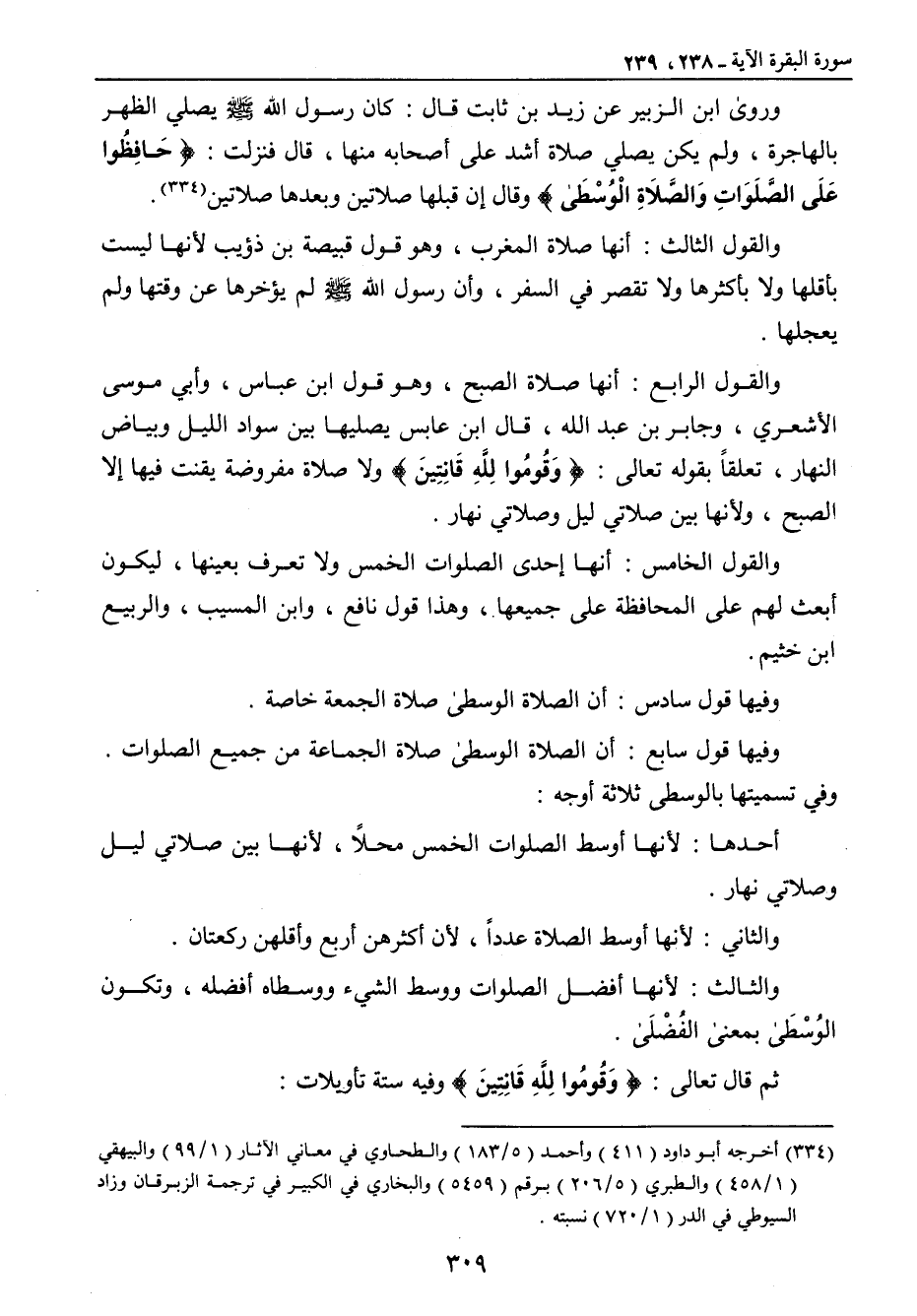 وروى ابن الزبير عن زيد بن ثابت قال: كان رسول الله صلى الله عليه وسلم يصلي الظهر بالهاجرة , ولم يكن يصلي صلاة أشد على أصحابه منها , قال فنزلت: {حَافِظُوا عَلَى الصَّلَوَاتِ وَالصَّلاَةِ الوُسْطَى} وقال إن قبلها صلاتين وبعدها صلاتين. والقول الثالث: أنها صلاة المغرب , وهو قول قبيصة بن ذؤيب لأنها ليست بأقلها ولا بأكثرها ولا تقصر في السفر , وأن رسول الله صلى الله عليه وسلم لم يؤخرها عن وقتها ولم يعجلها. والقول الرابع: أنها صلاة الصبح , وهو قول ابن عباس , وأبي موسى الأشعري , وجابر بن عبد الله , قال ابن عباس يصليها بين سواد الليل وبياض النهار , تعلقاً بقوله تعالى: {وَقُومُوا لِلَّهِ قَانِتِينَ} ولا صلاة مفروضة يقنت فيها إلا الصبح , ولأنها بين صلاتي ليل وصلاتي نهار. والقول الخامس: أنها إحدى الصلوات الخمس ولا تعرف بعينها , ليكون أبعث لهم على المحافظة على جميعها , وهذا قول نافع , وابن المسيب , والربيع ابن خثيم. وفيها قول سادس: أن الصلاة الوسطى صلاة الجمعة خاصة. وفيها قول سابع: أن الصلاة الوسطى صلاة الجماعة من جميع الصلوات. وفي تسميتها بالوسطى ثلاثة أوجه: أحدها: لأنها أوسط الصلوات الخمس محلاً , لأنها بين صلاتي ليل وصلاتي نهار. والثاني: لأنها أوسط الصلاة عدداً , لأن أكثرهن أربع وأقلهن ركعتان. والثالث: لأنها أفضل الصلوات ووسط الشيء ووسطاه أفضله , وتكون الوُسْطَى بمعنى الفُضْلَى. ثم قال تعالى: {وَقُومُوا لِلَّهِ قَانِتِينَ} وفيه ستة تأويلات: