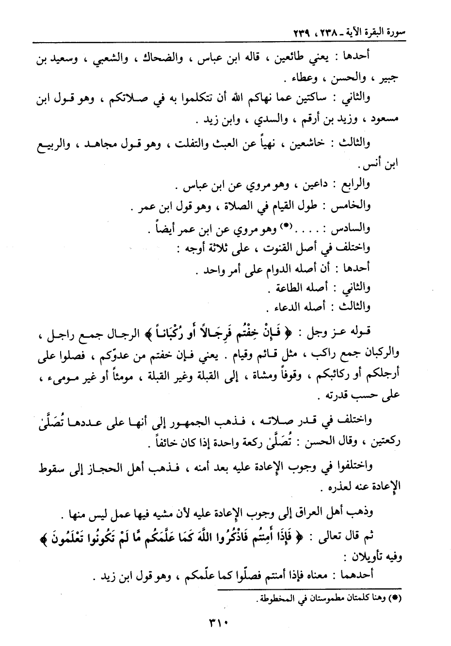 أحدها: يعني طائعين , قاله ابن عباس , والضحاك , والشعبي , وسعيد بن جبير , والحسن , وعطاء. والثاني: ساكتين عما نهاكم الله أن تتكلموا به في صلاتكم , وهو قول ابن مسعود , وزيد بن أرقم , والسدي , وابن زيد. والثالث: خاشعين , نهيأ عن العبث والتفلت , وهو قول مجاهد , والربيع بن أنس. والرابع: داعين , وهو مروي عن ابن عباس. والخامس: طول القيام في الصلاة , وهو قول ابن عمر. والسادس: ... . وهو مروي عن ابن عمر أيضا. واختلف في أصل القنوت , على ثلاثة أوجه: أحدها: أن أصله الدوام على أمر واحد. والثاني: أصله الطاعة. والثالث: أصله الدعاء. قوله عز وجل: {فَإِنْ خِفْتُم فَرِجَالاً أَو رُكْبَاناً} الرجال جمع راجل , والركبان جمع راكب , مثل قائم وقيام. يعني فإن خفتم من عدوّكم , فصلوا على أرجلكم أو ركائبكم , وقوفاً ومشاة , إلى القبلة وغير القبلة , مومئاً أو غير مومىء , على حسب قدرته. واختلف في قدر صلاته , فذهب الجمهور إلى أنها على عددها تُصَلَّى ركعتين , وقال الحسن: تُصَلَّى ركعة واحدة إذا كان خائفاً. واختلفوا في وجوب الإِعادة عليه بعد أمنه , فذهب أهل الحجاز إلى سقوط الإِعادة عنه لعذره. وذهب أهل العراق إلى وجوب الإِعادة عليه لأن مشيه فيها عمل ليس منها. ثم قال تعالى: {فَإِذَا أَمِنتُم فَاذْكُرُوا اللَّهَ كَمَا عَلَّمَكُم مَّا لَمْ تَكُونُوا تَعْلَمُونَ} وفيه تأويلان: أحدهما: معناه فإذا أمنتم فصلّوا كما علّمكم , وهو قول ابن زيد.